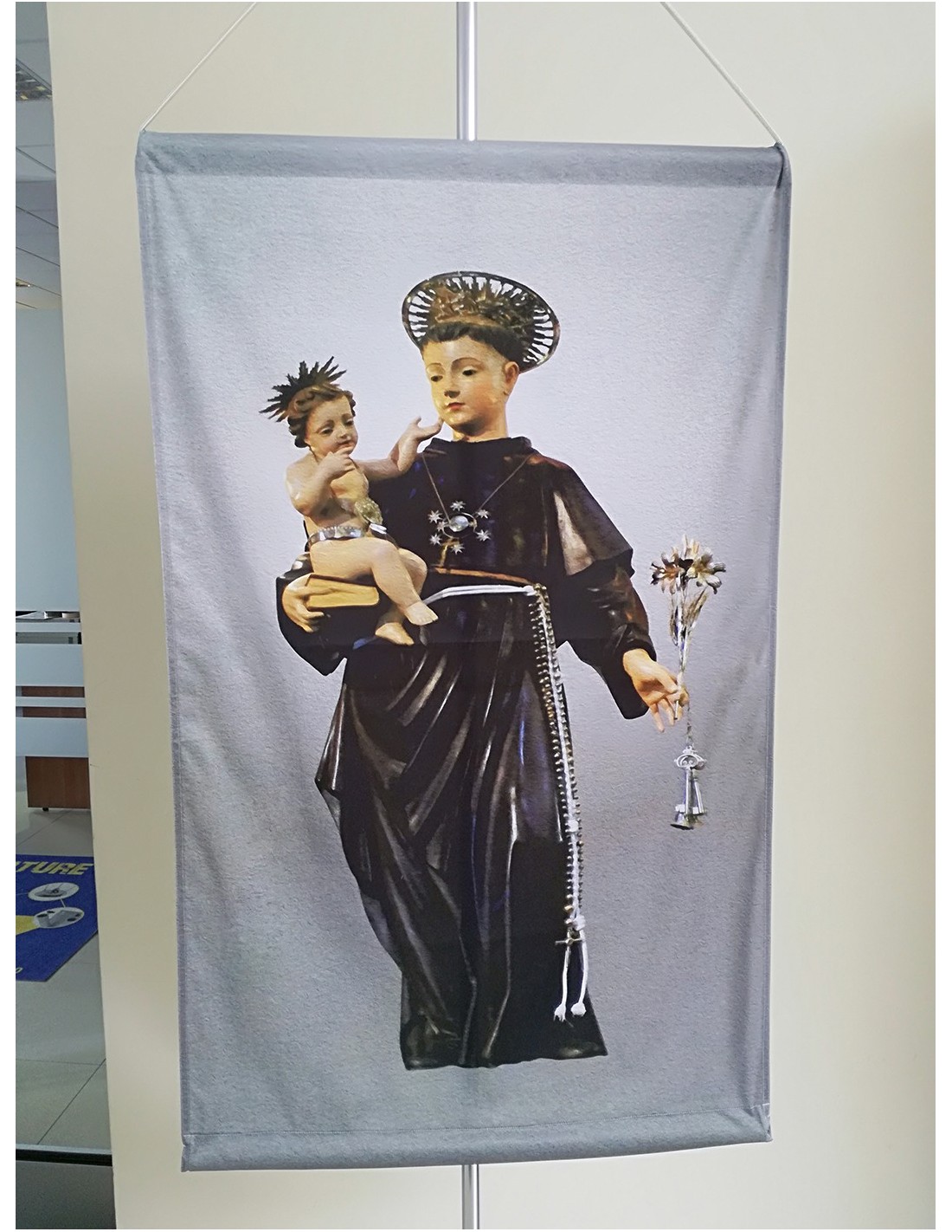Stendardi immagini sacre (qualsiasi immagine su richiesta), stampato ad alta risoluzione su tessuto 450 gr e rifinito come da foto (Sant'Antonio di Padova in questo caso). Misura Stendardo cm 70x100 o similari