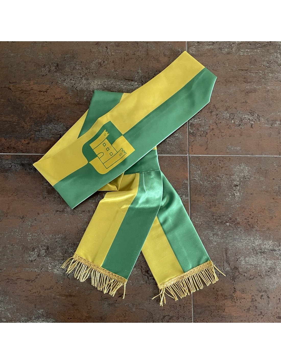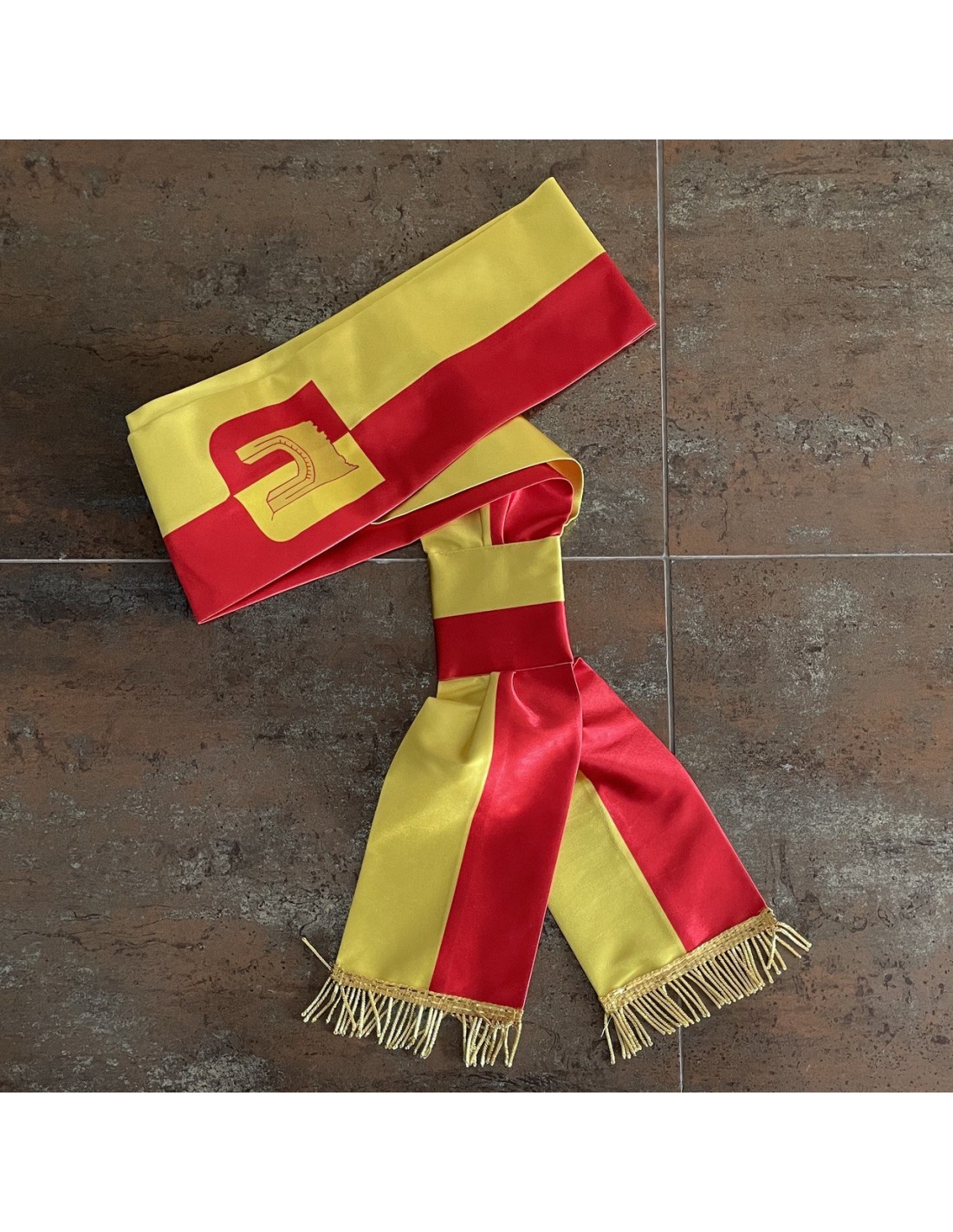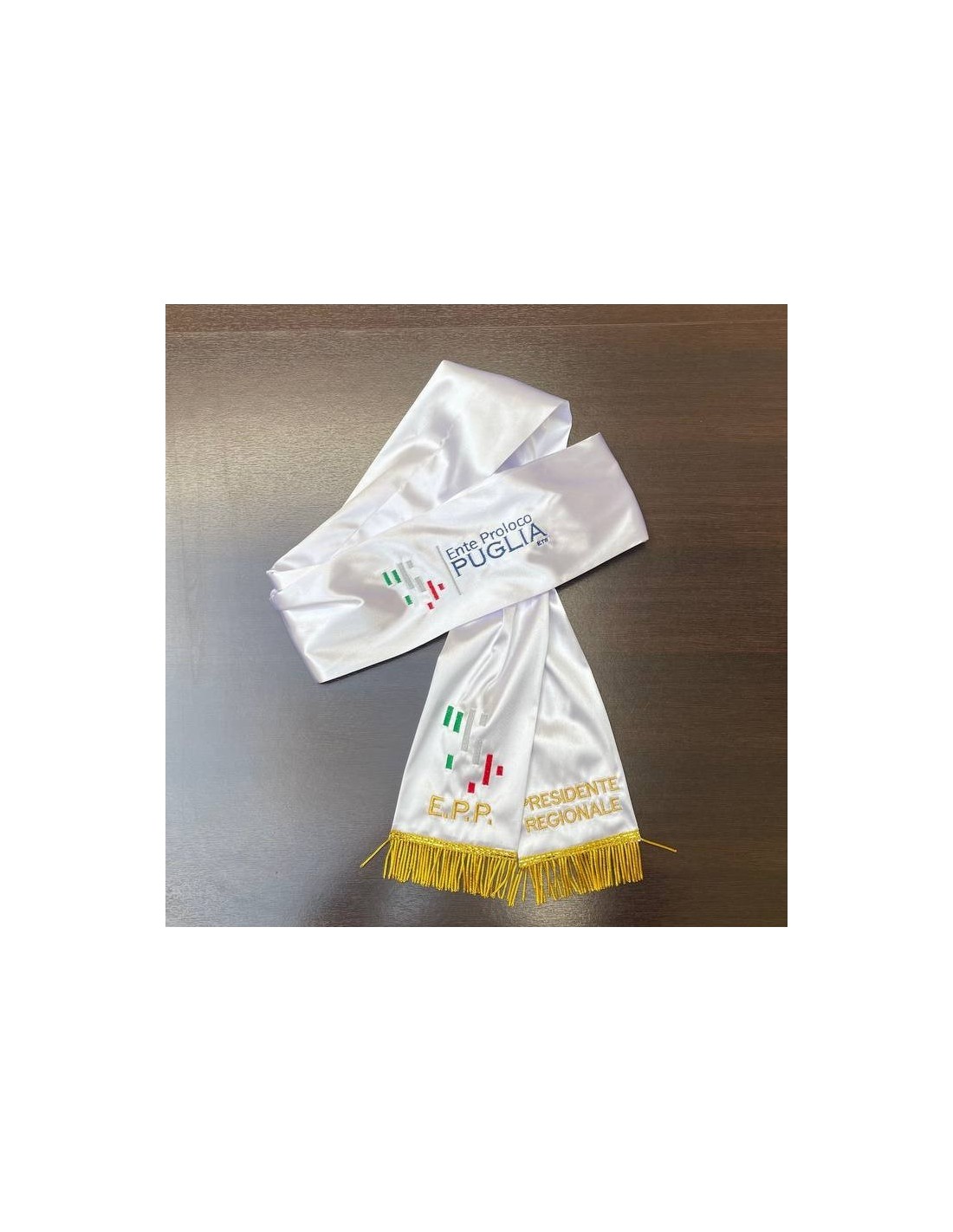 Fascia per associazioni e organizzazioni, realizzata in seta, stemmi e testi ricamati a macchina e rifiniti a mano, oltre all'aggiunta della frangia oro/argento in canuttiglia.