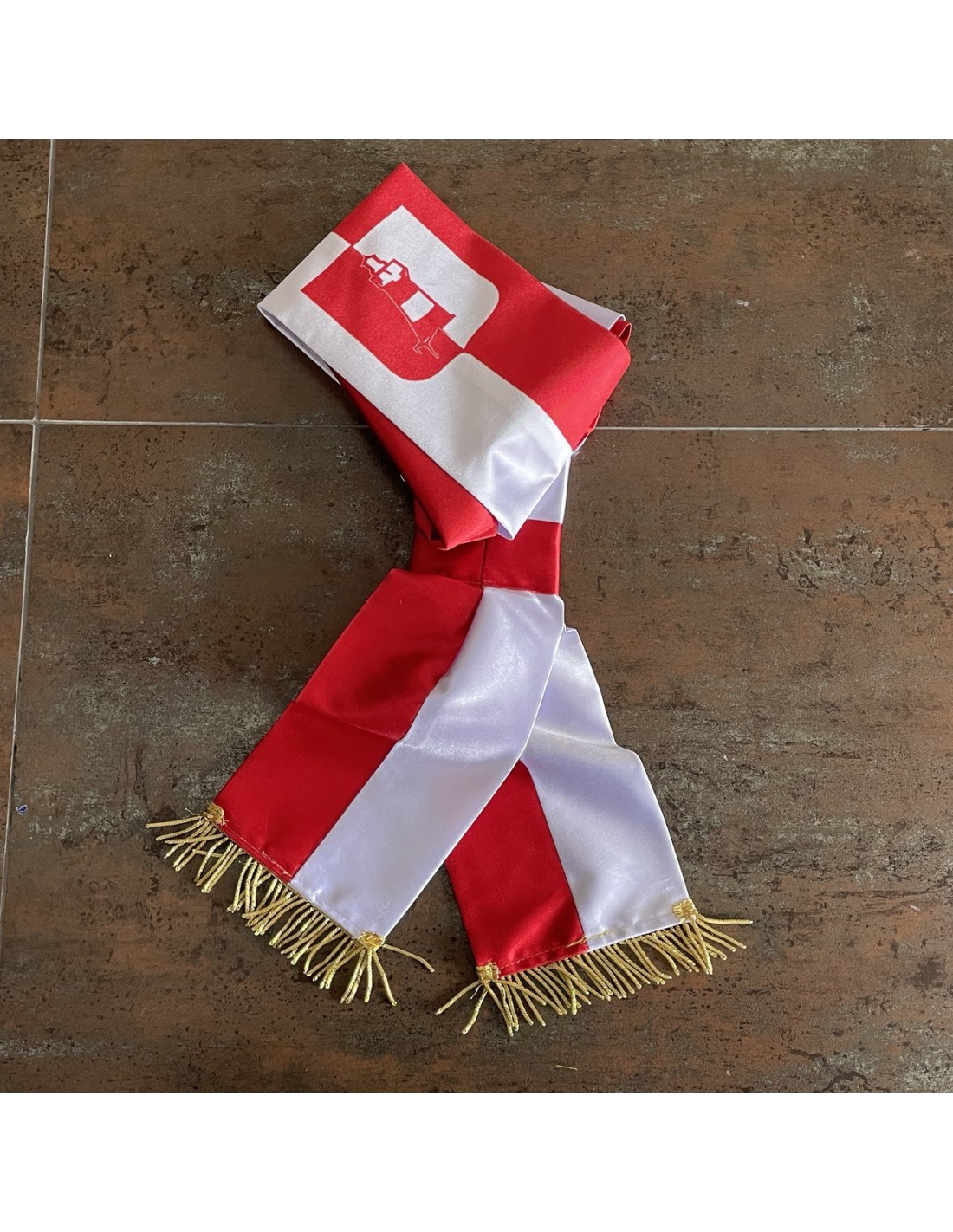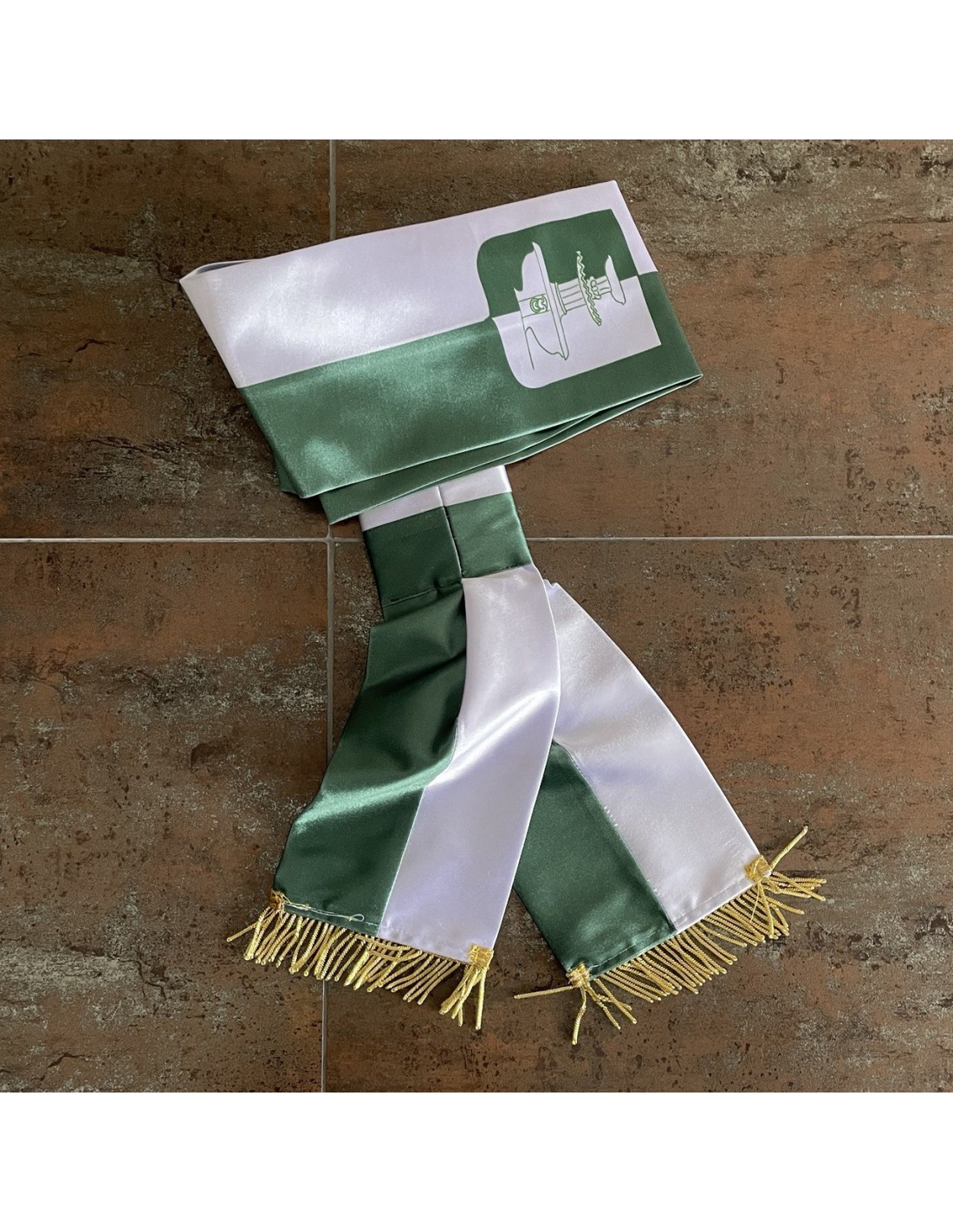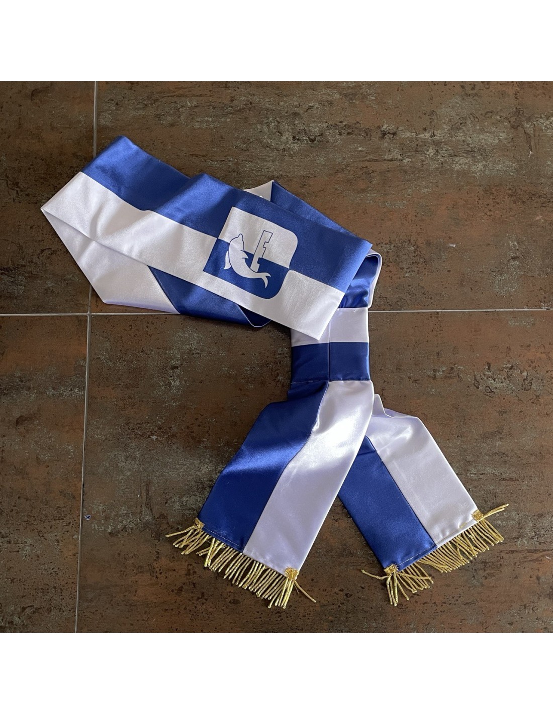 Fascia per associazioni e organizzazioni, realizzata in seta, stemmi e testi ricamati a macchina e rifiniti a mano, oltre all'aggiunta della frangia oro/argento in canuttiglia.