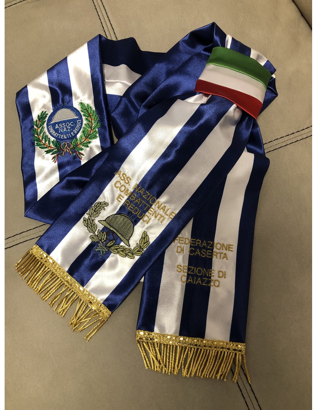Fascia per associazione nazionale combattenti e reduci, realizzata in seta, stemmi e testi ricamati a macchina e rifiniti a mano, oltre all'aggiunta della frangia oro/argento in canuttiglia.