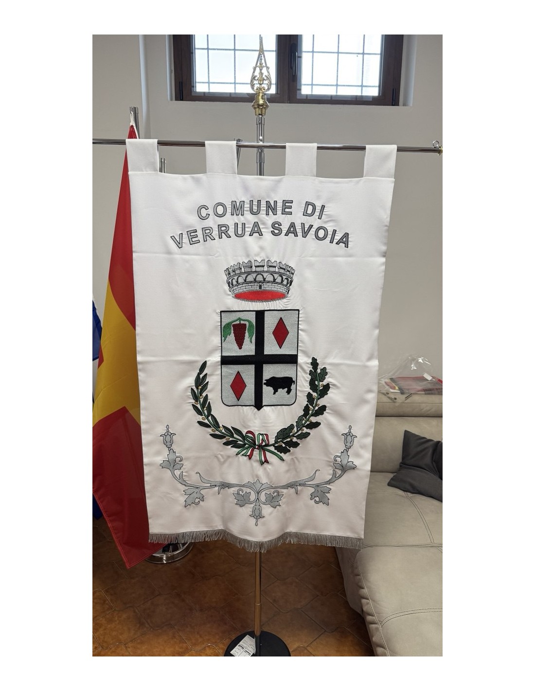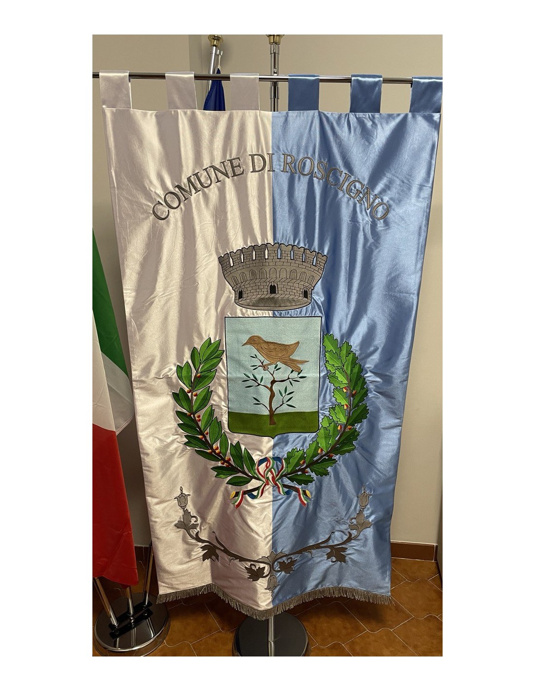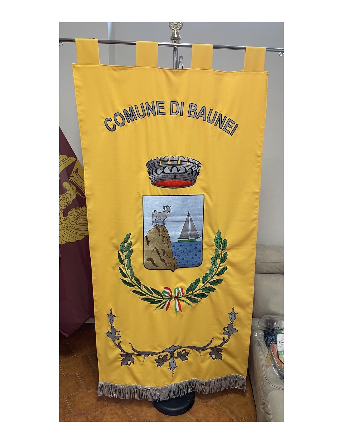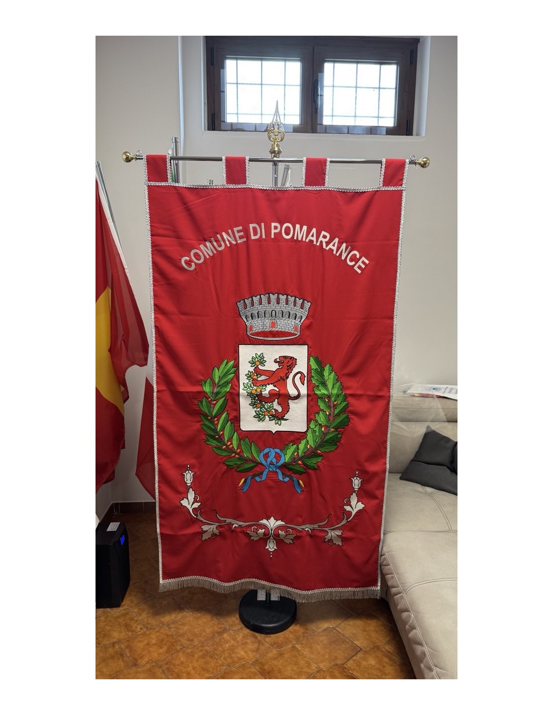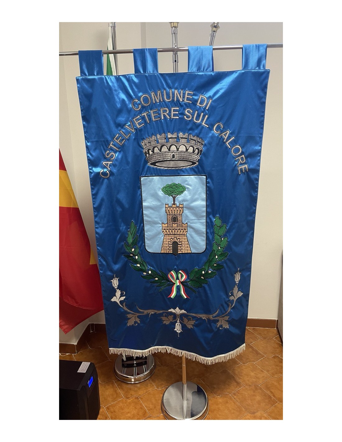 Gonfalone ricamato con code 100,00 iva esclusa di lavorazione aggiuntiva.