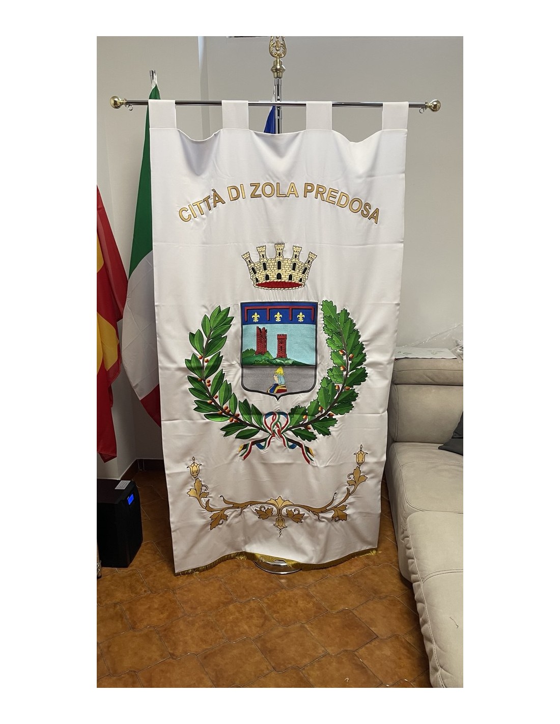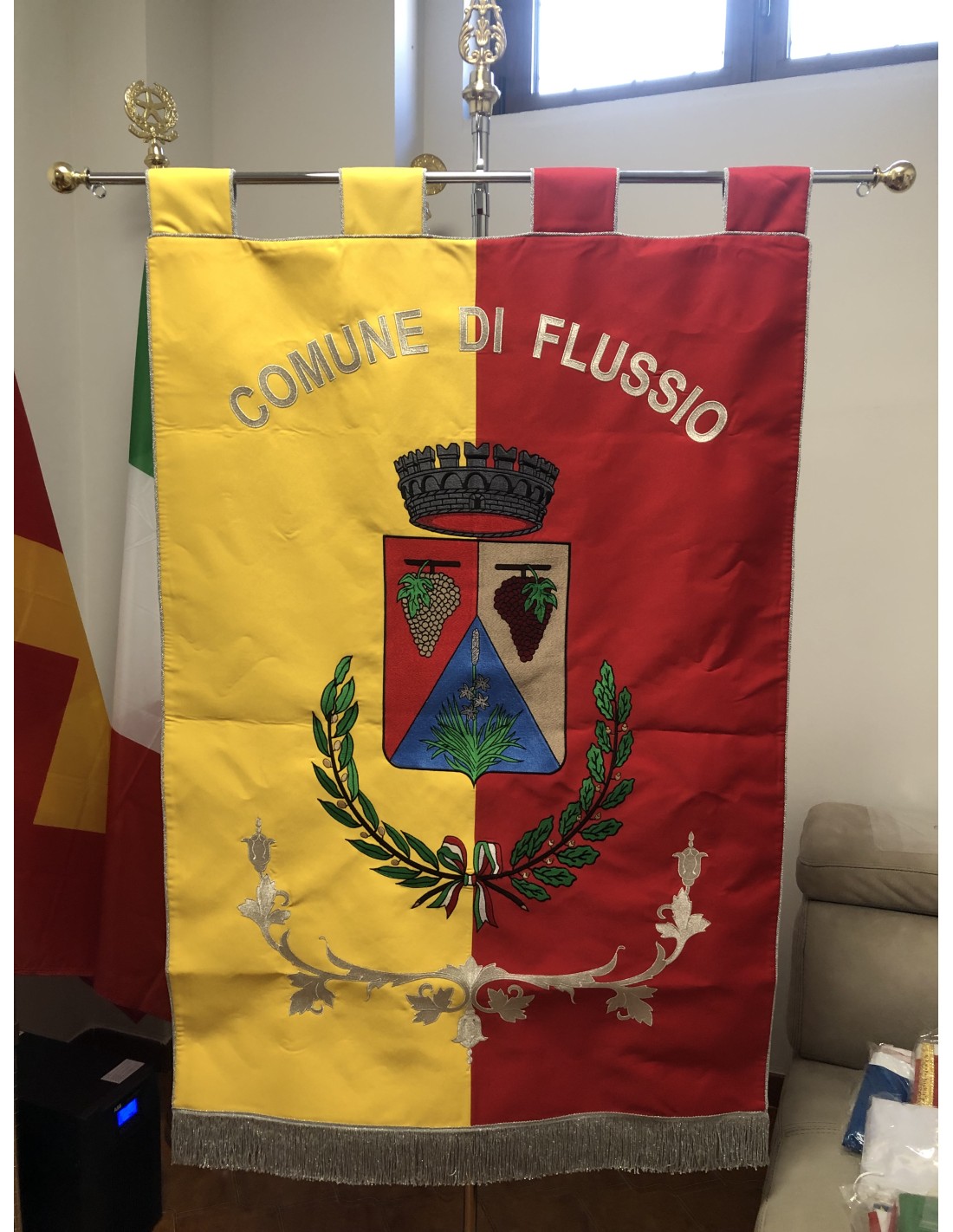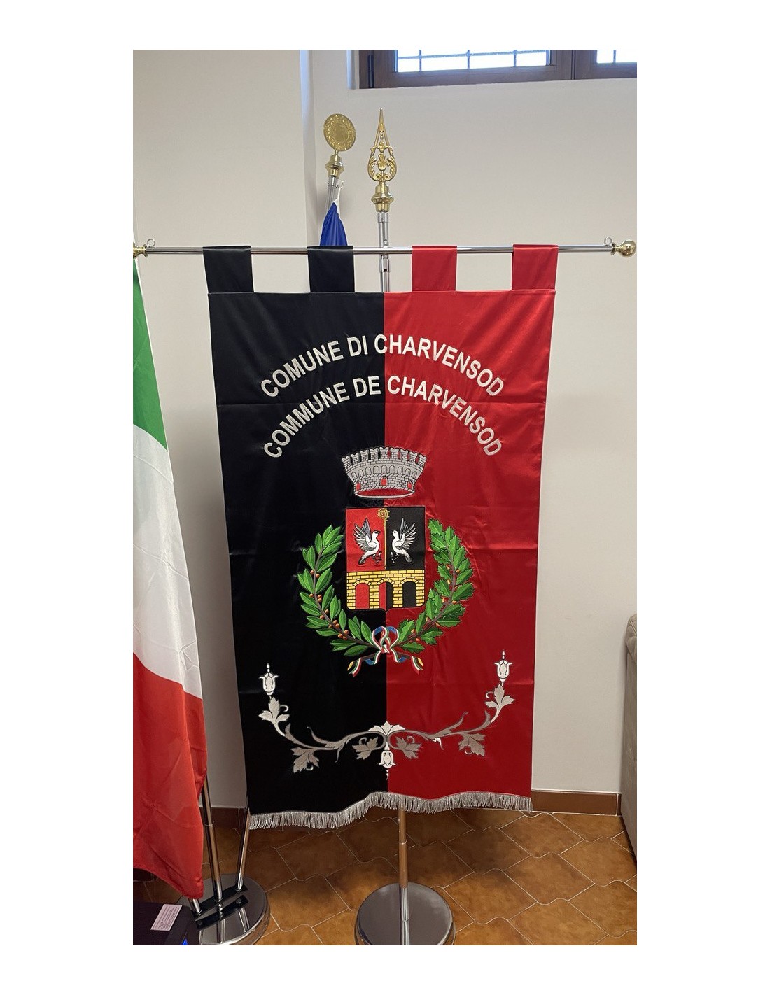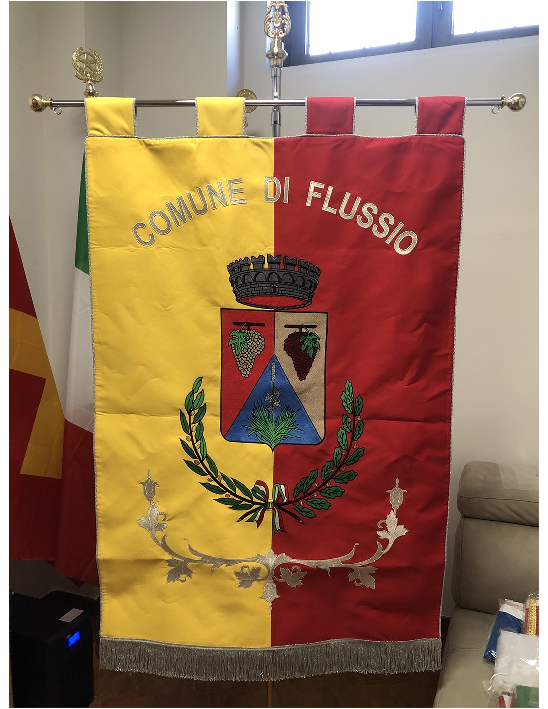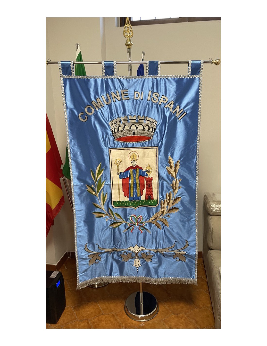 Gonfalone ricamato con code 100,00 iva esclusa di lavorazione aggiuntiva.