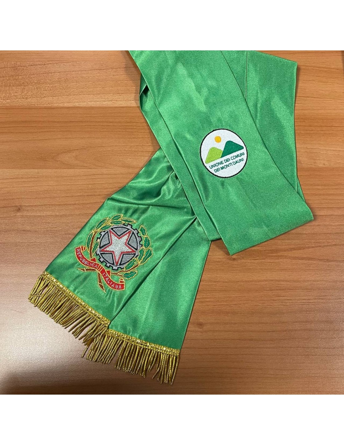 Fascia Presidente Comunità Montana realizzata in seta, doppio stemma Repubblica Italiana e Comunità Montana, ricamati a macchina e rifiniti a mano, oltre all'aggiunta della frangia oro/argento in canuttiglia.