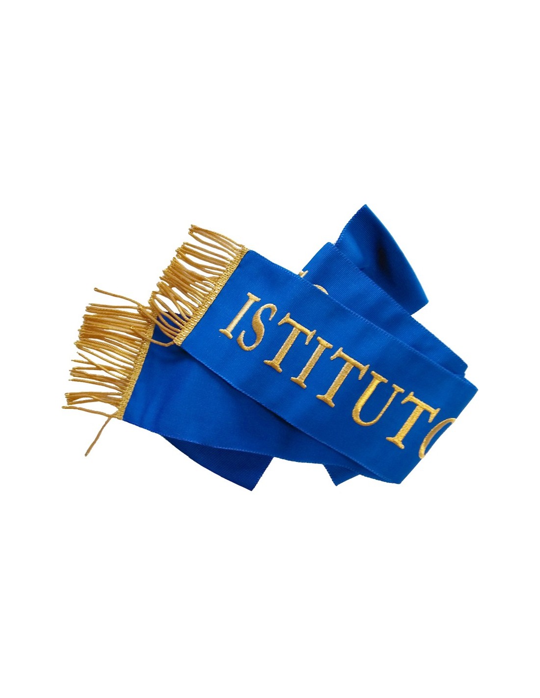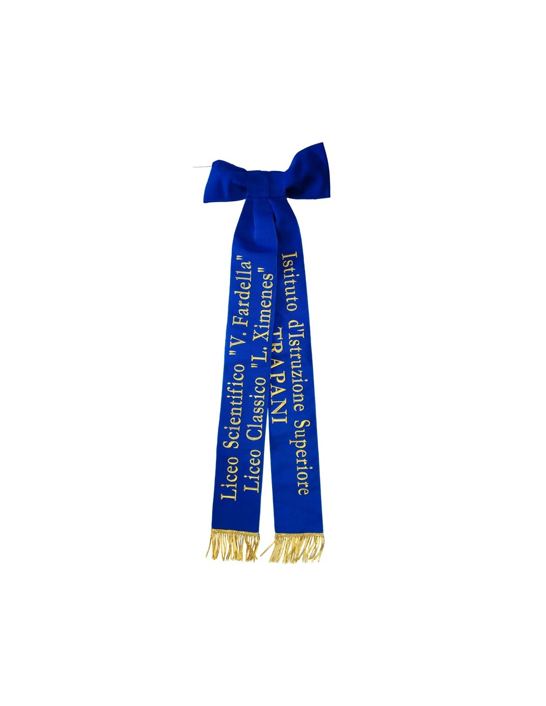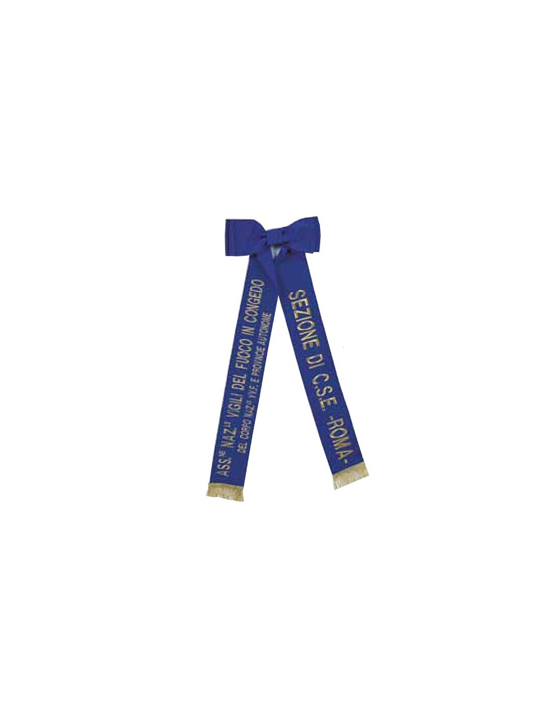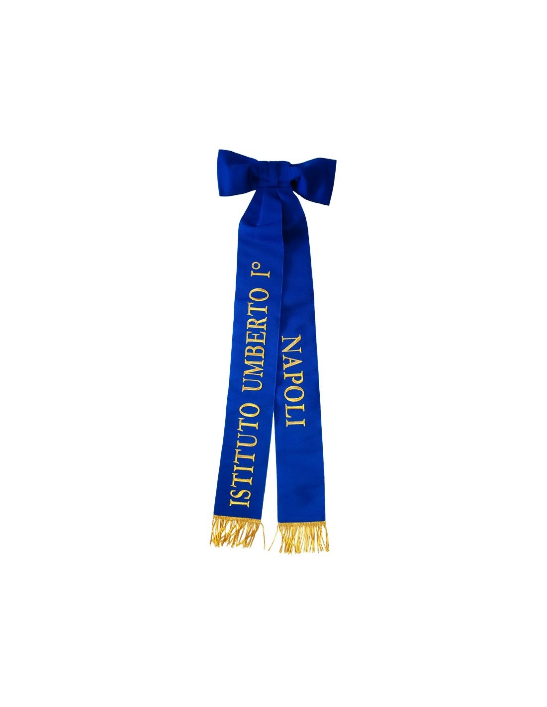 Ricamato con lettere oro a rilievo, con due code con frangia oro.