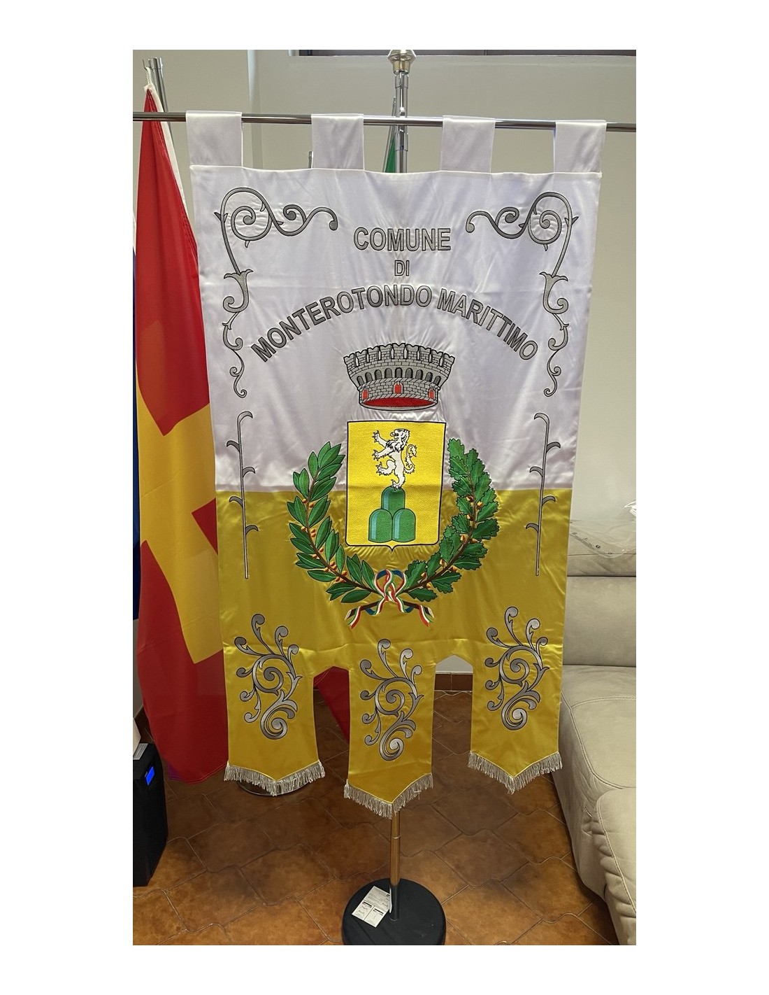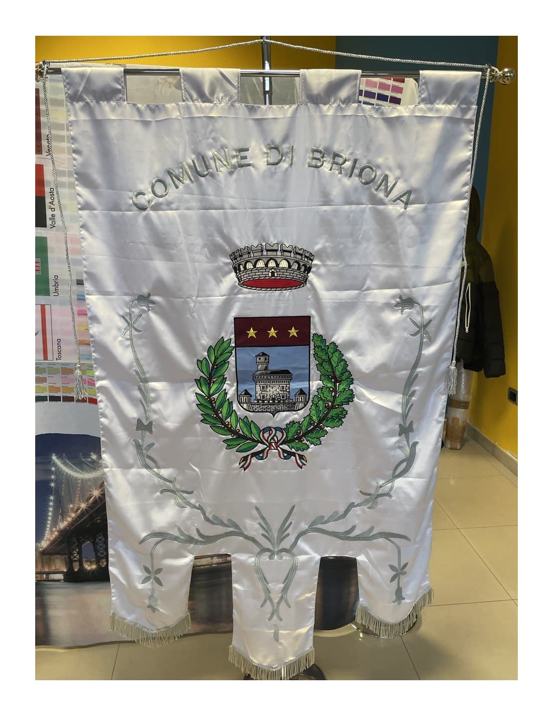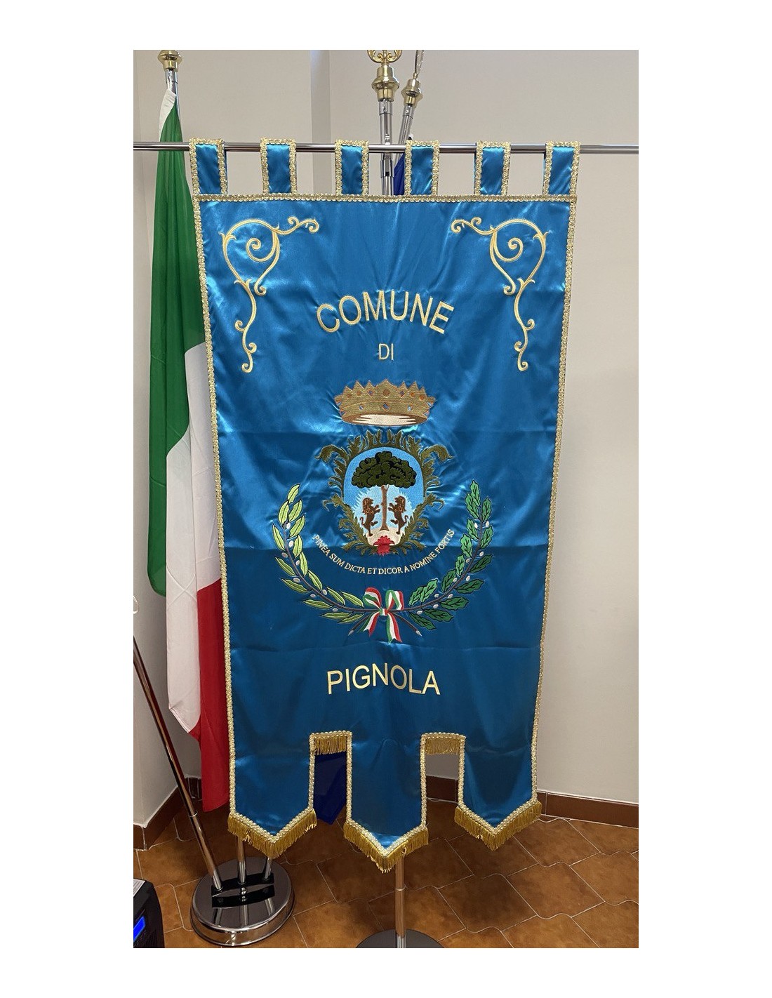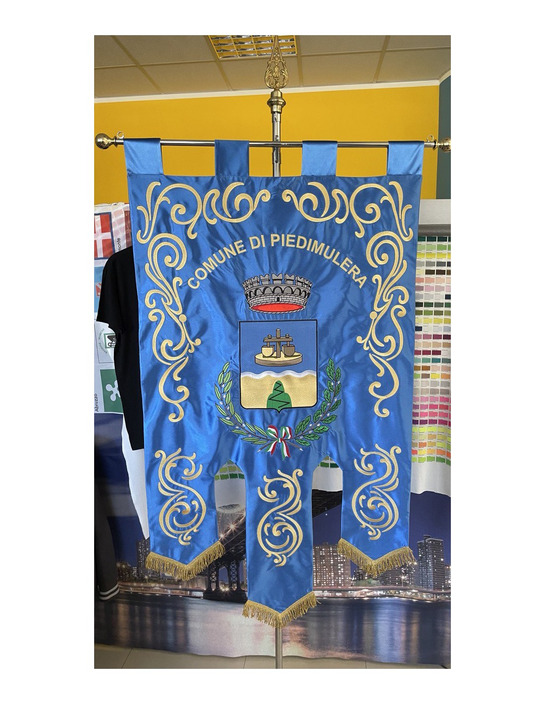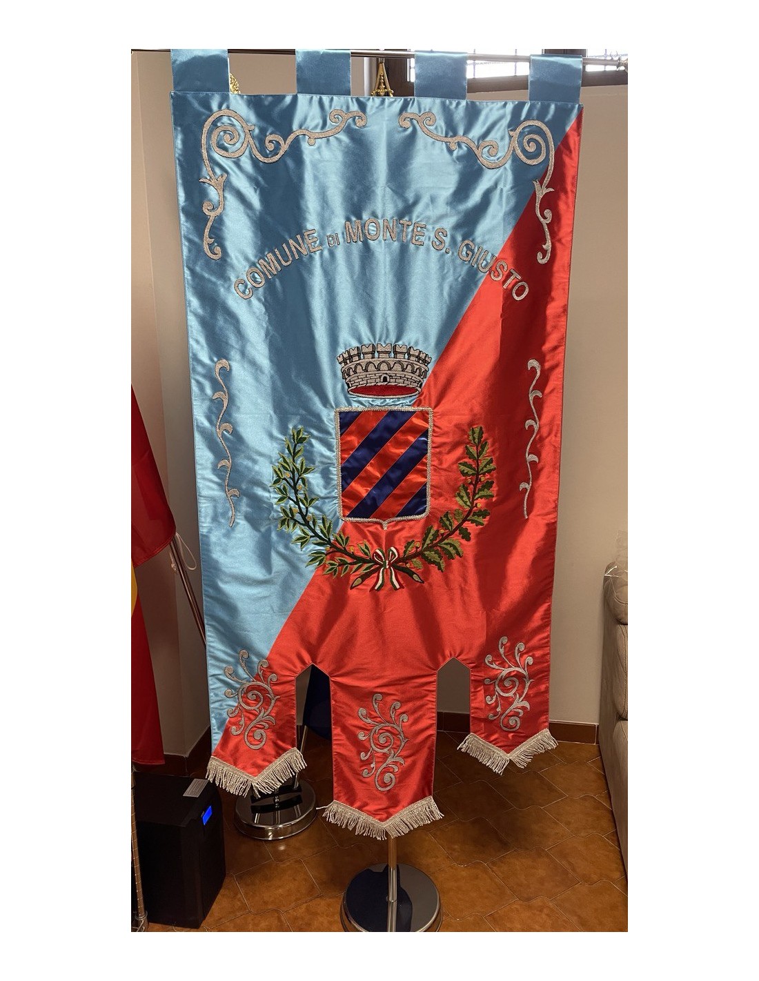 Gonfalone ricamato con code 100,00 iva esclusa di lavorazione aggiuntiva.