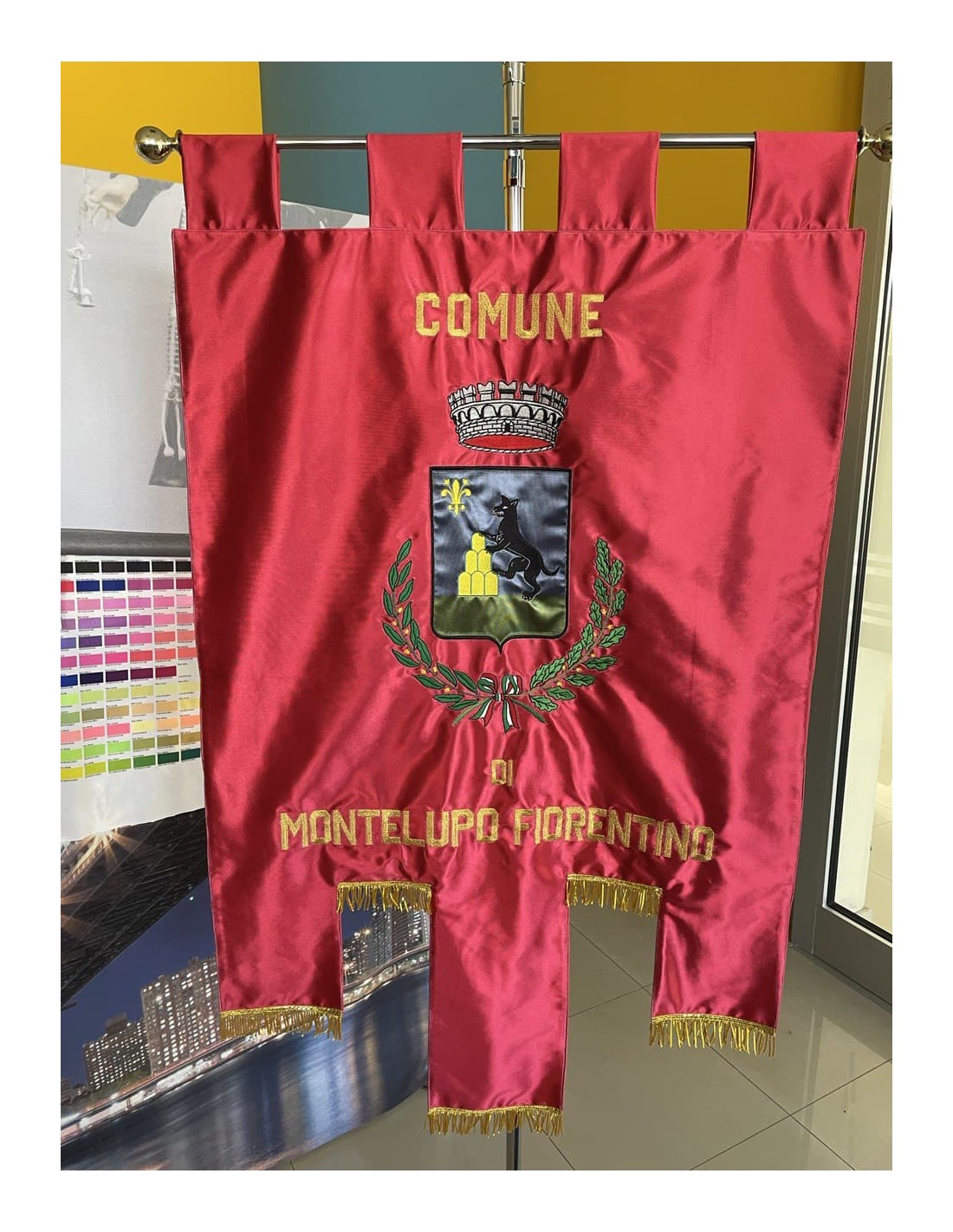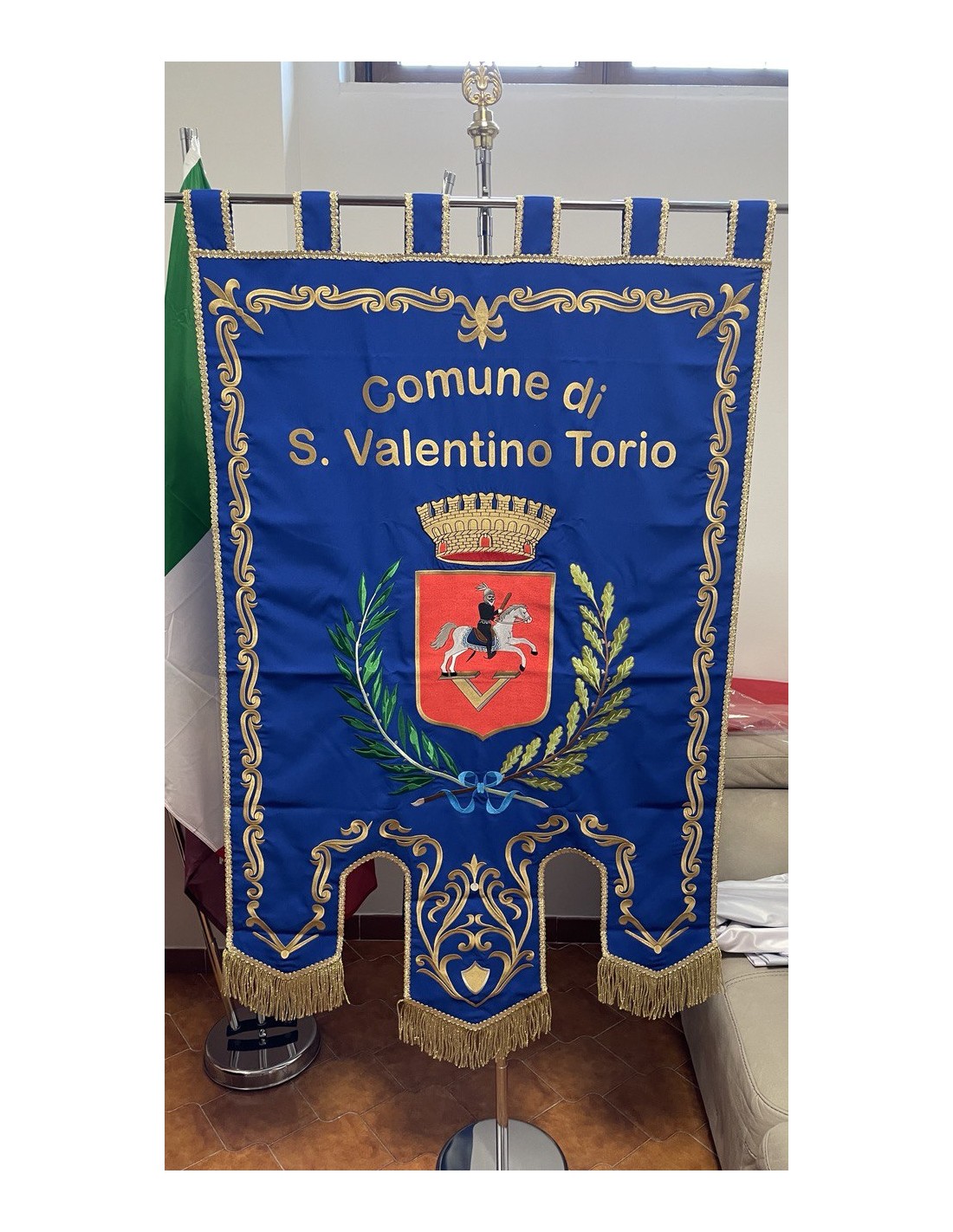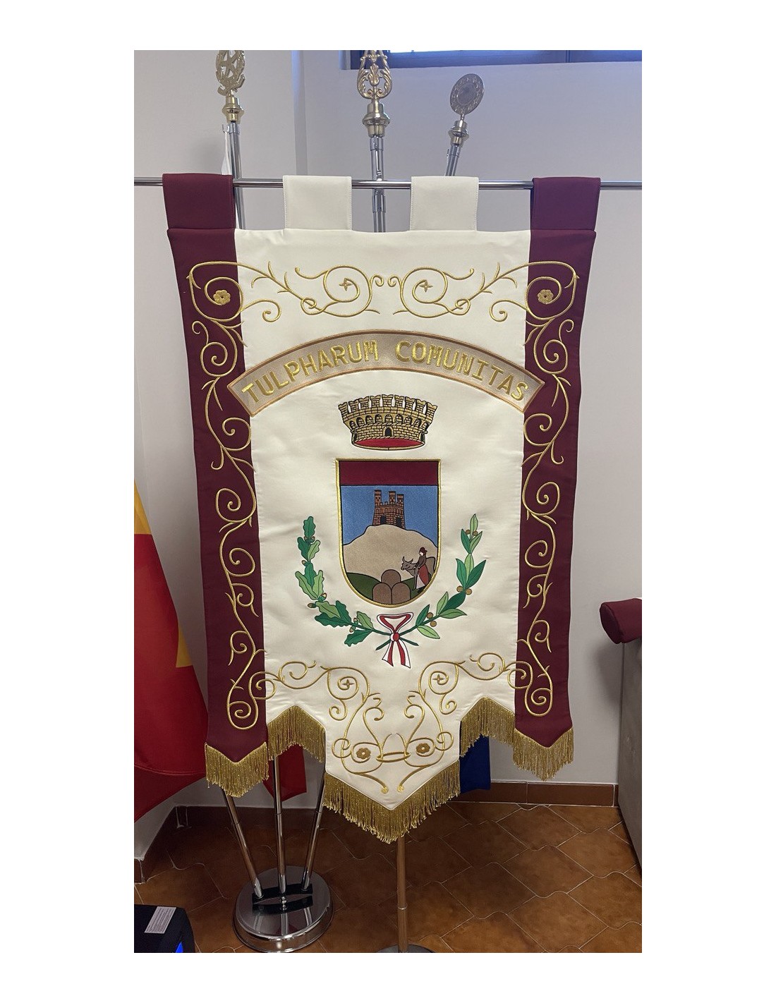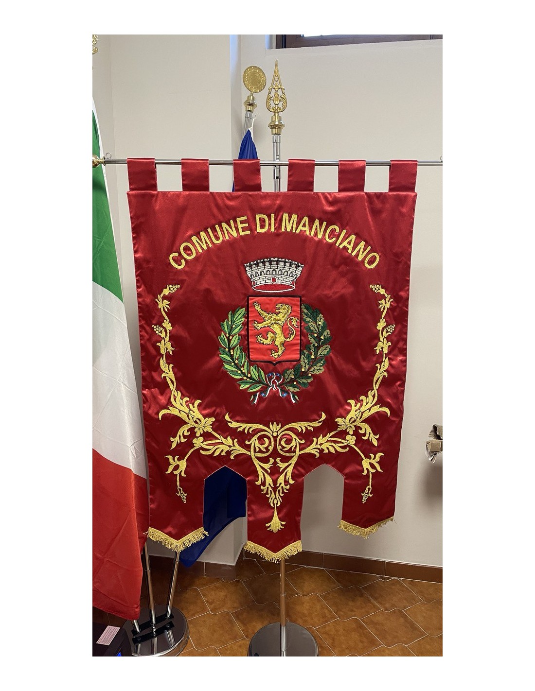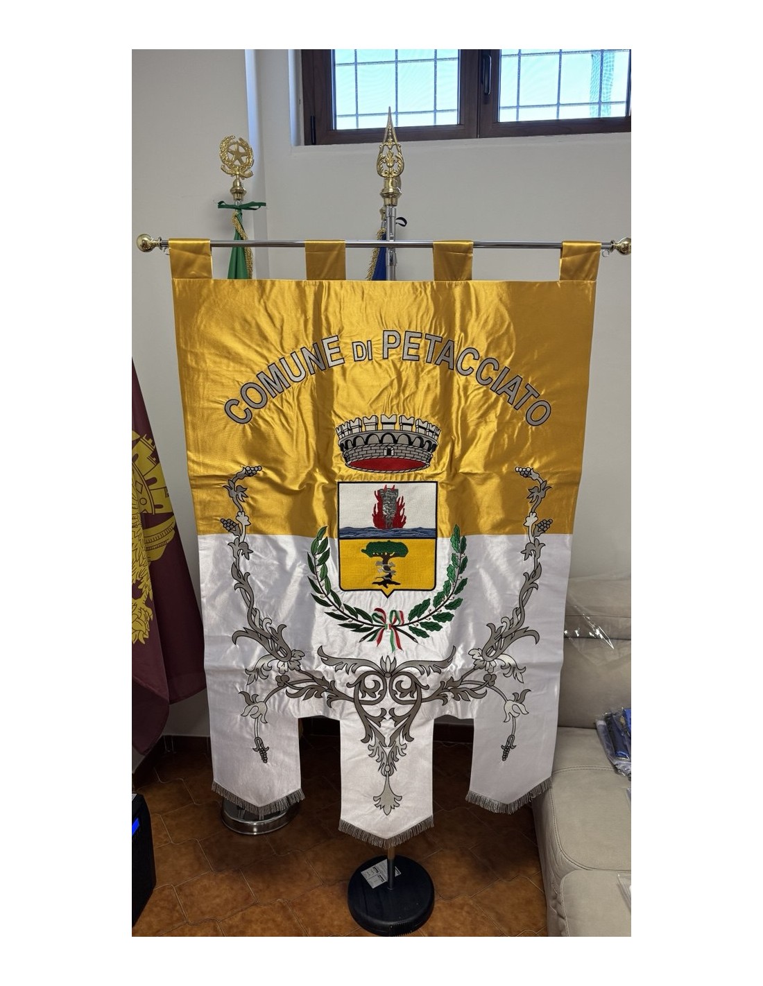 Gonfalone ricamato con code 100,00 iva esclusa di lavorazione aggiuntiva.