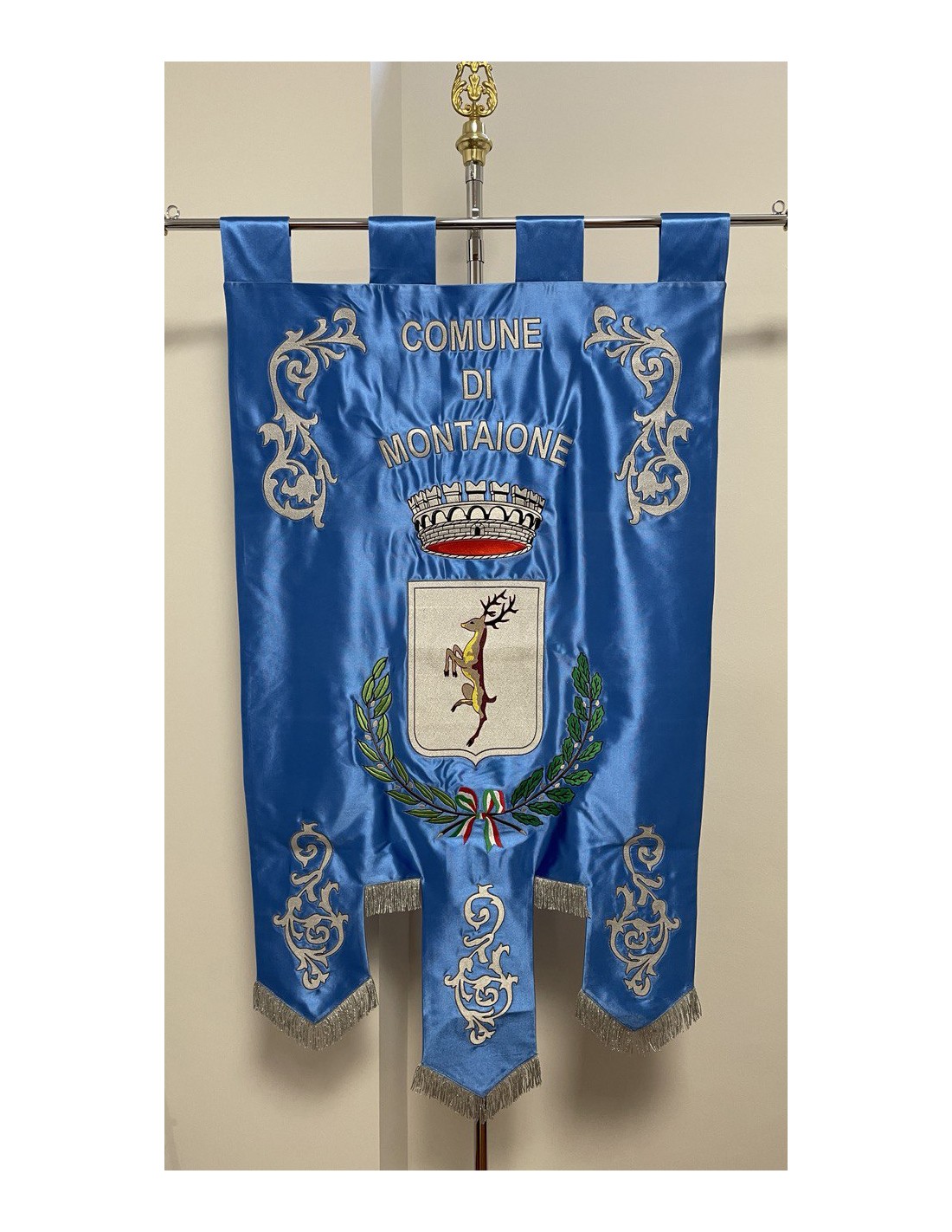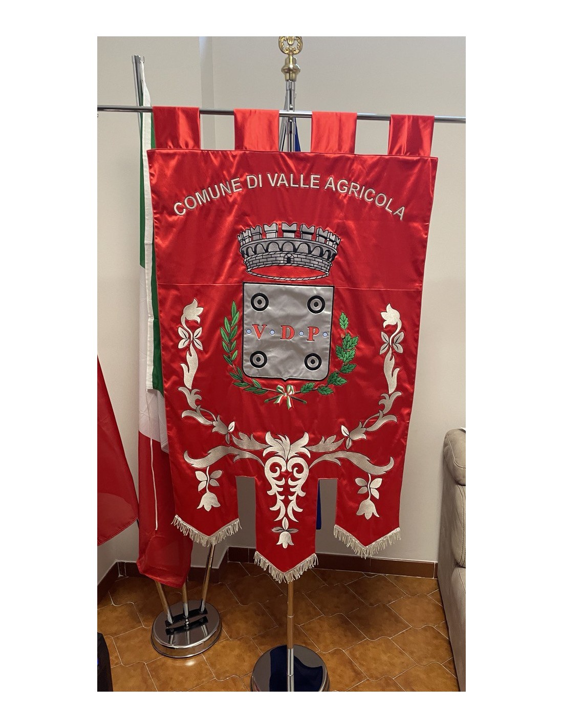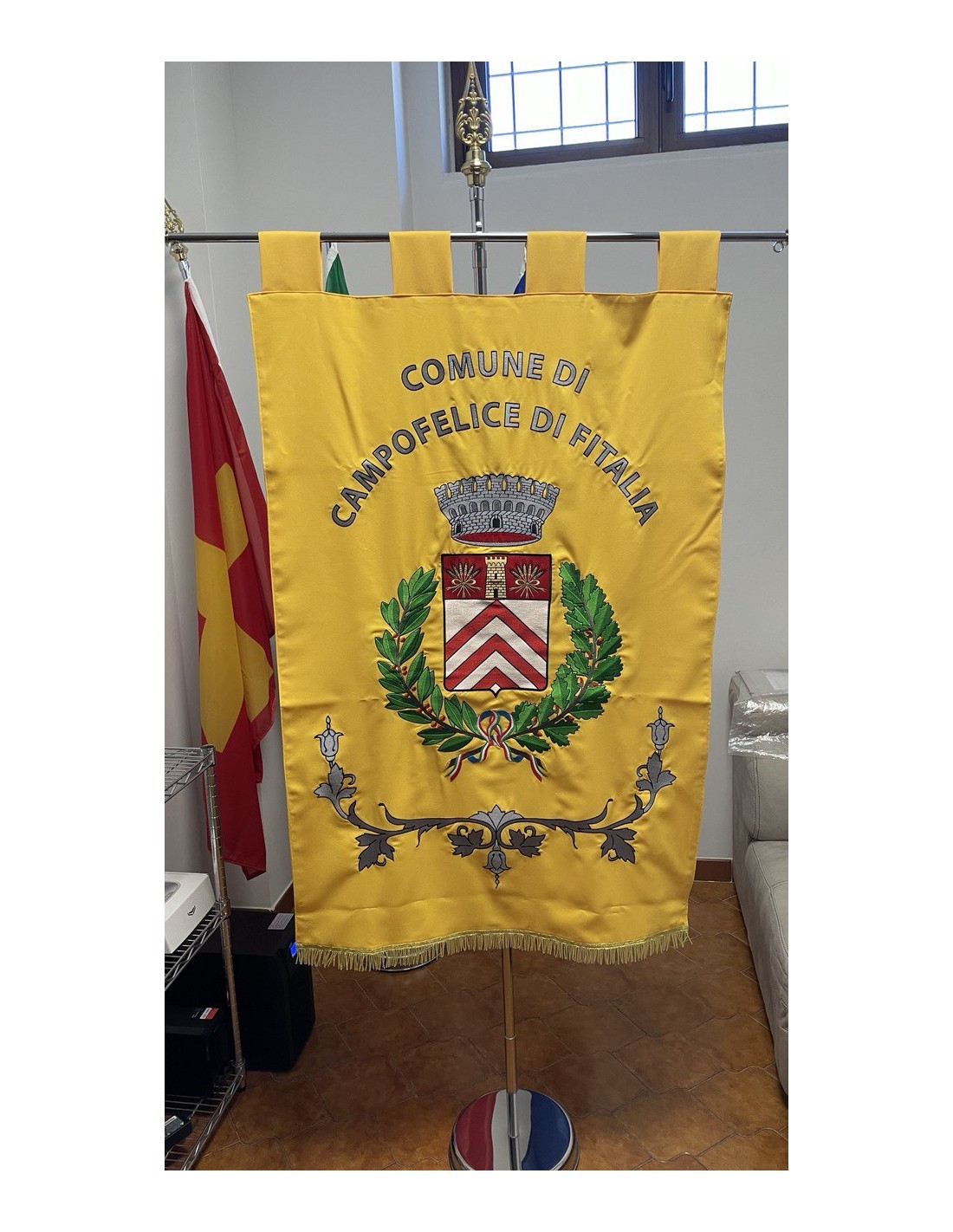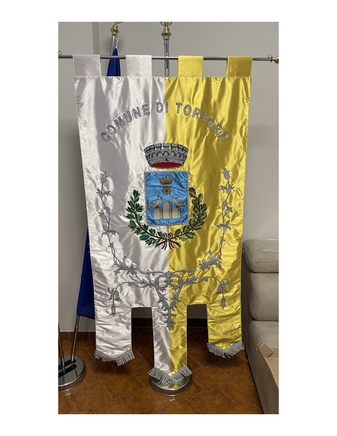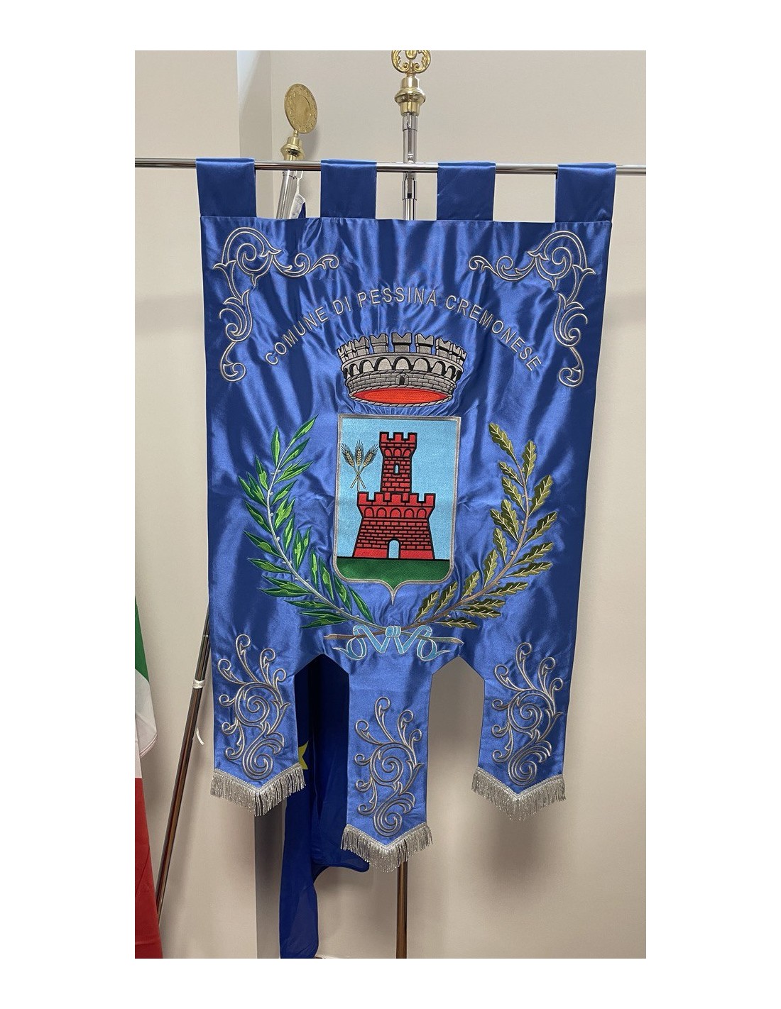 Gonfalone ricamato con code 100,00 iva esclusa di lavorazione aggiuntiva.