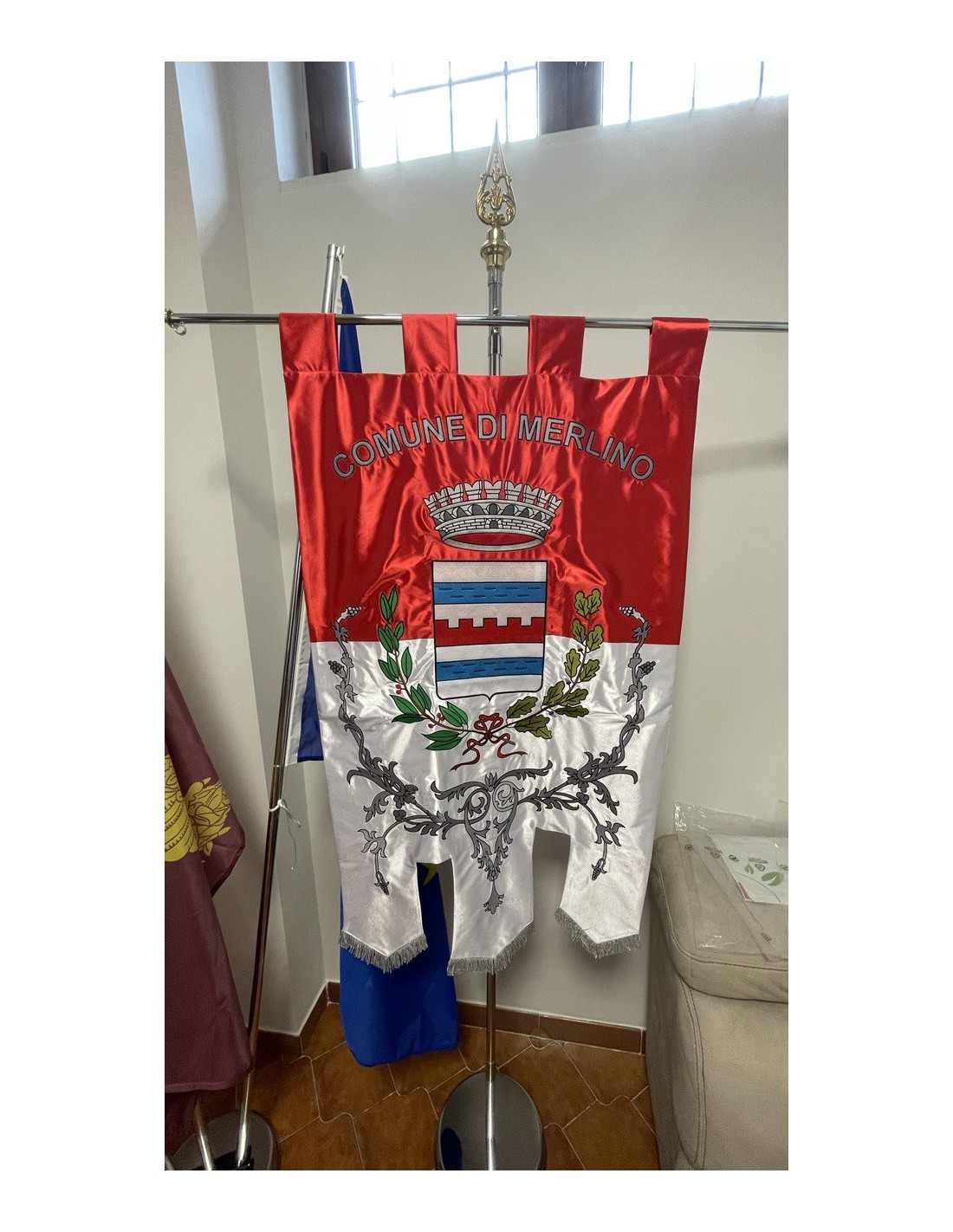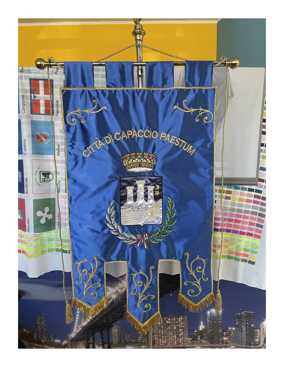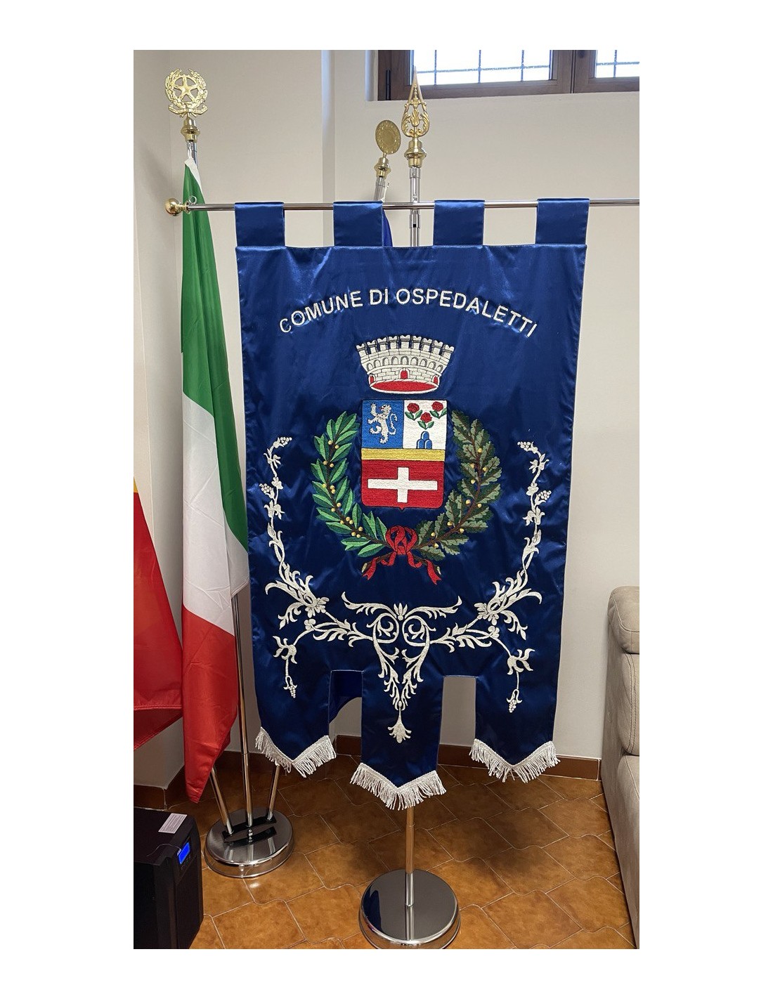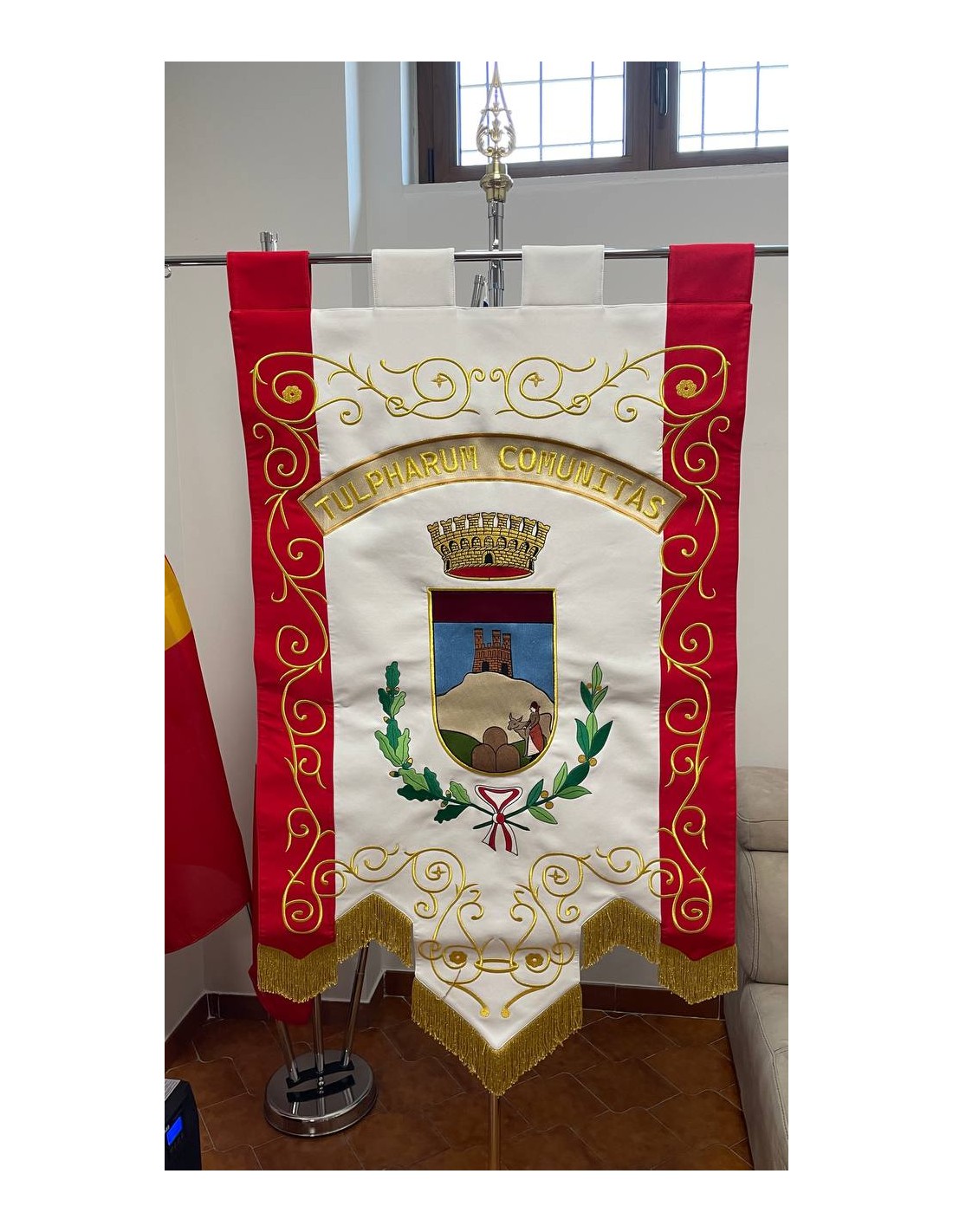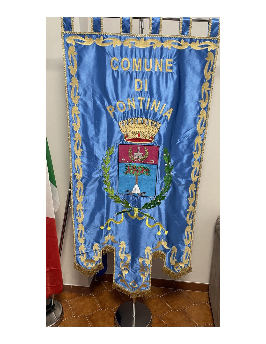 Gonfalone ricamato con code 100,00 iva esclusa di lavorazione aggiuntiva.