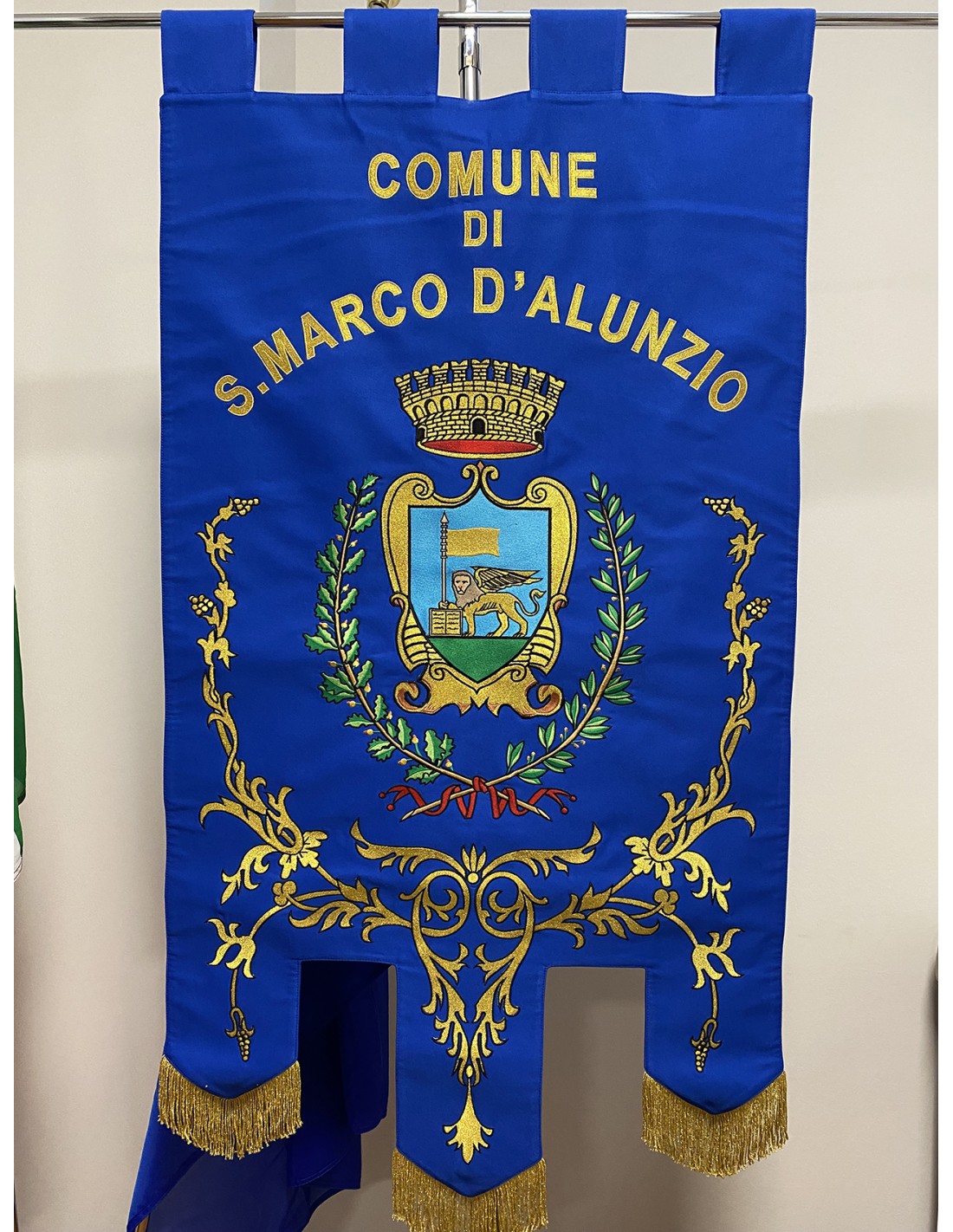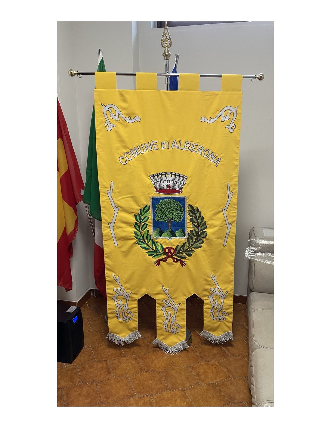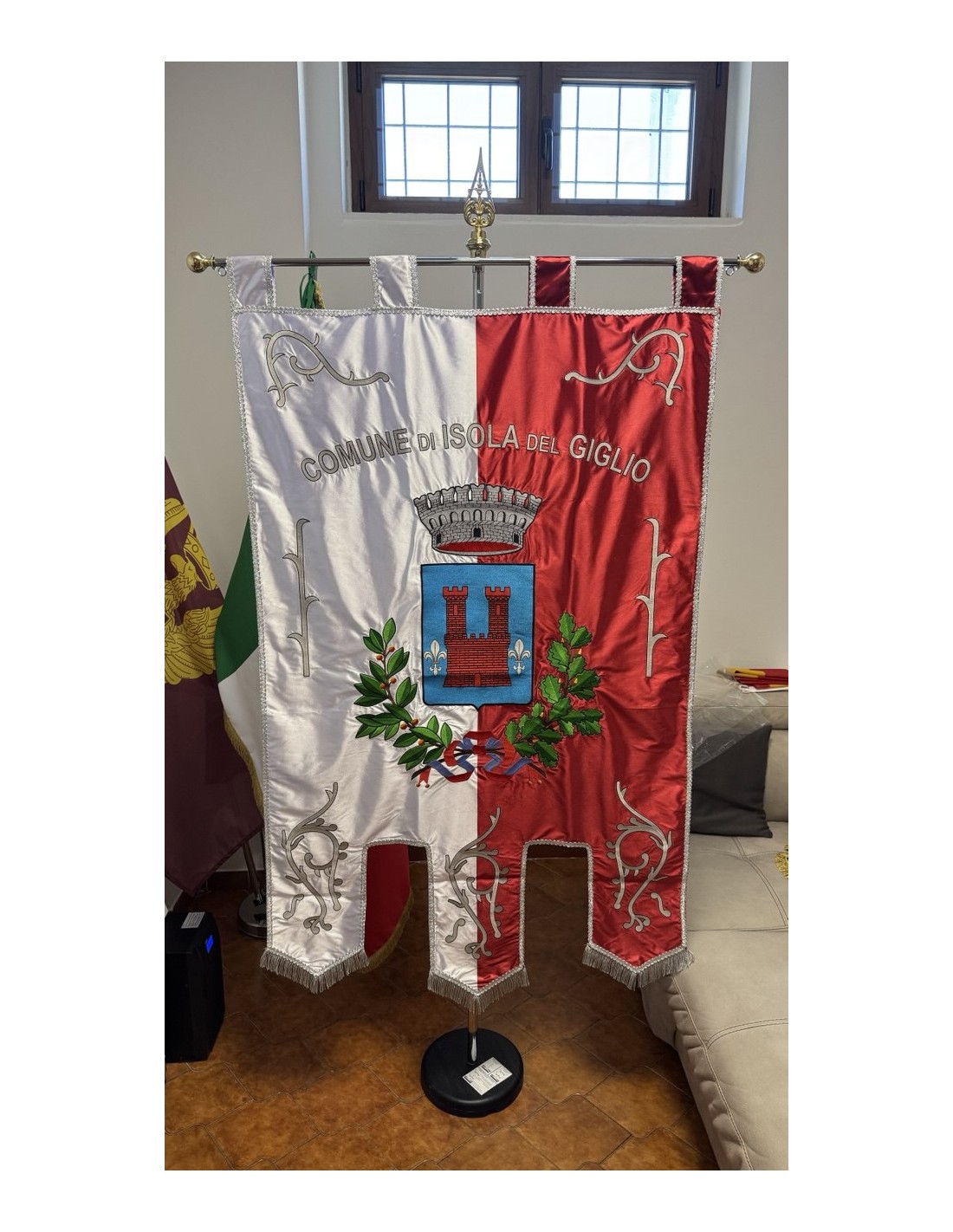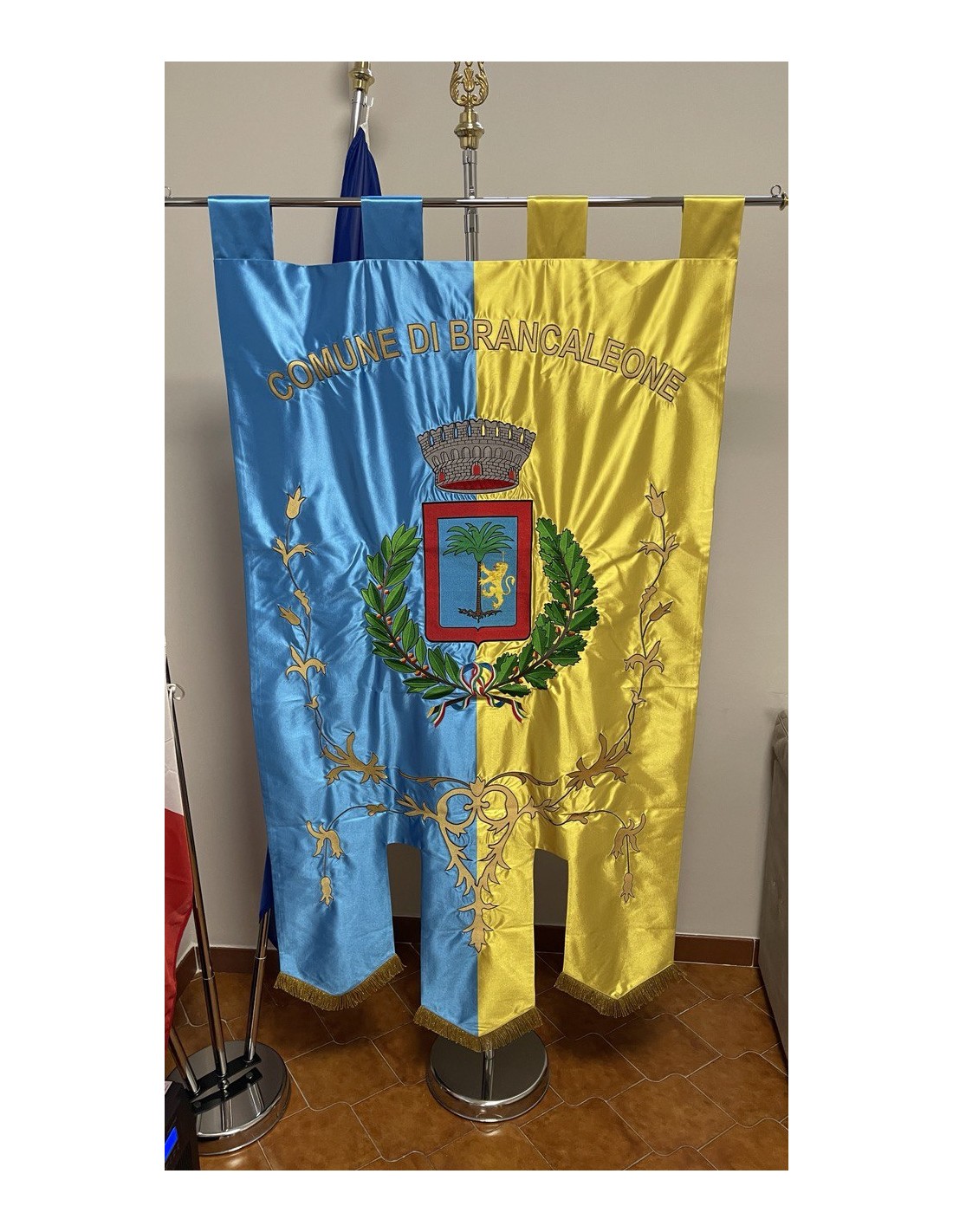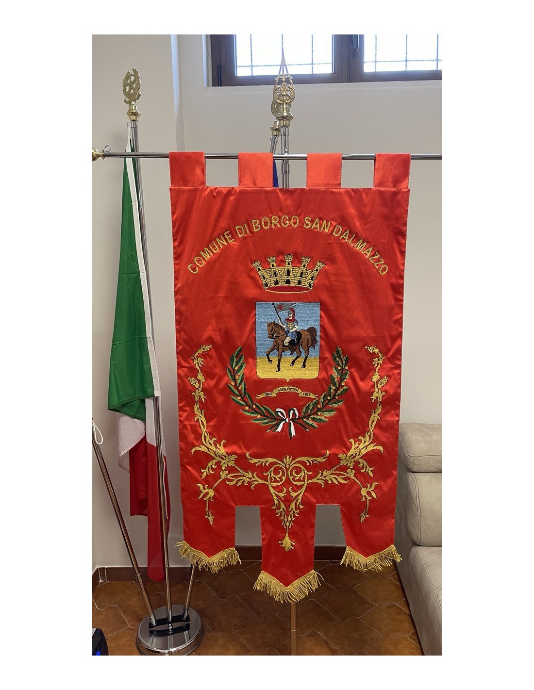 Gonfalone ricamato con code 100,00 iva esclusa di lavorazione aggiuntiva.
