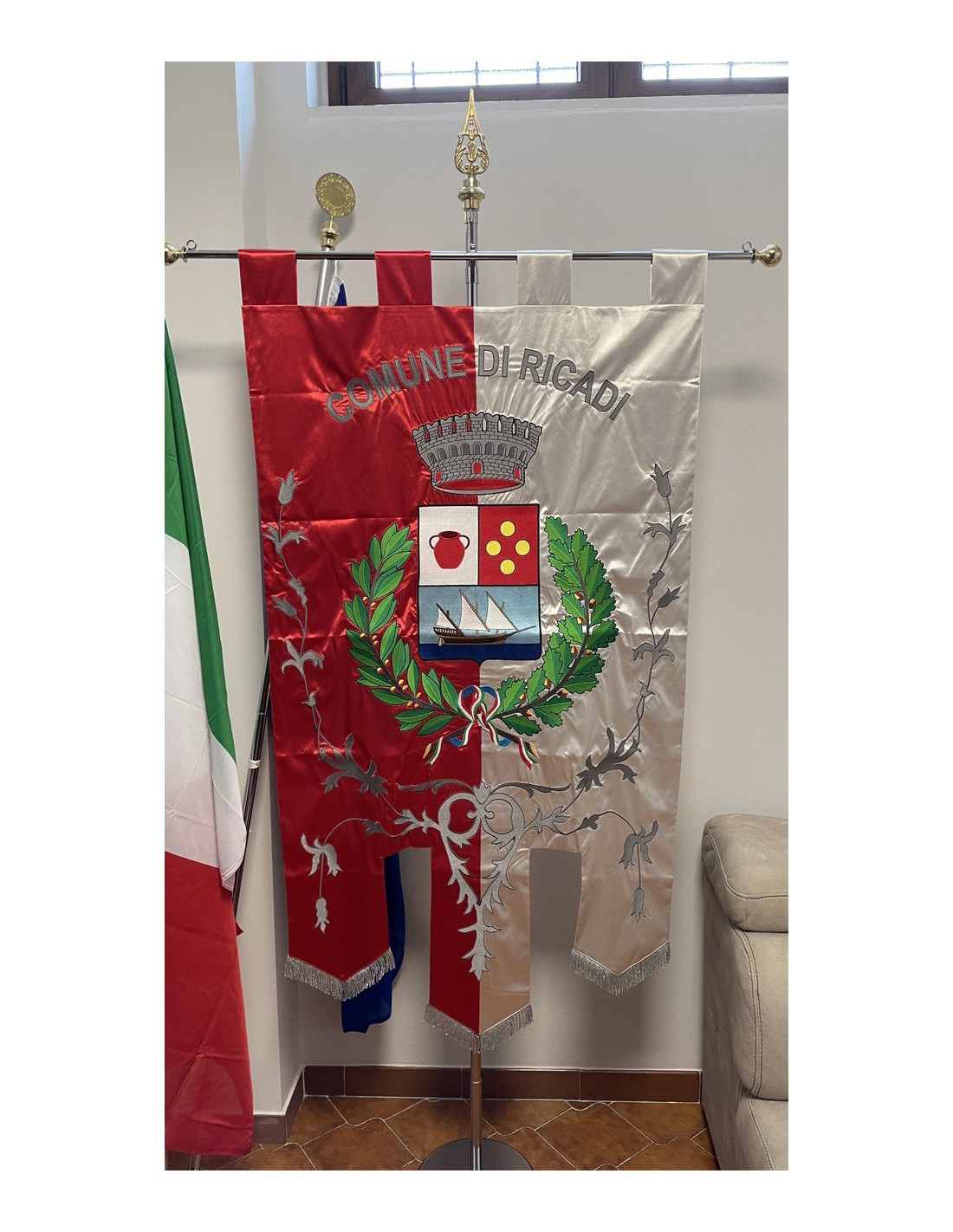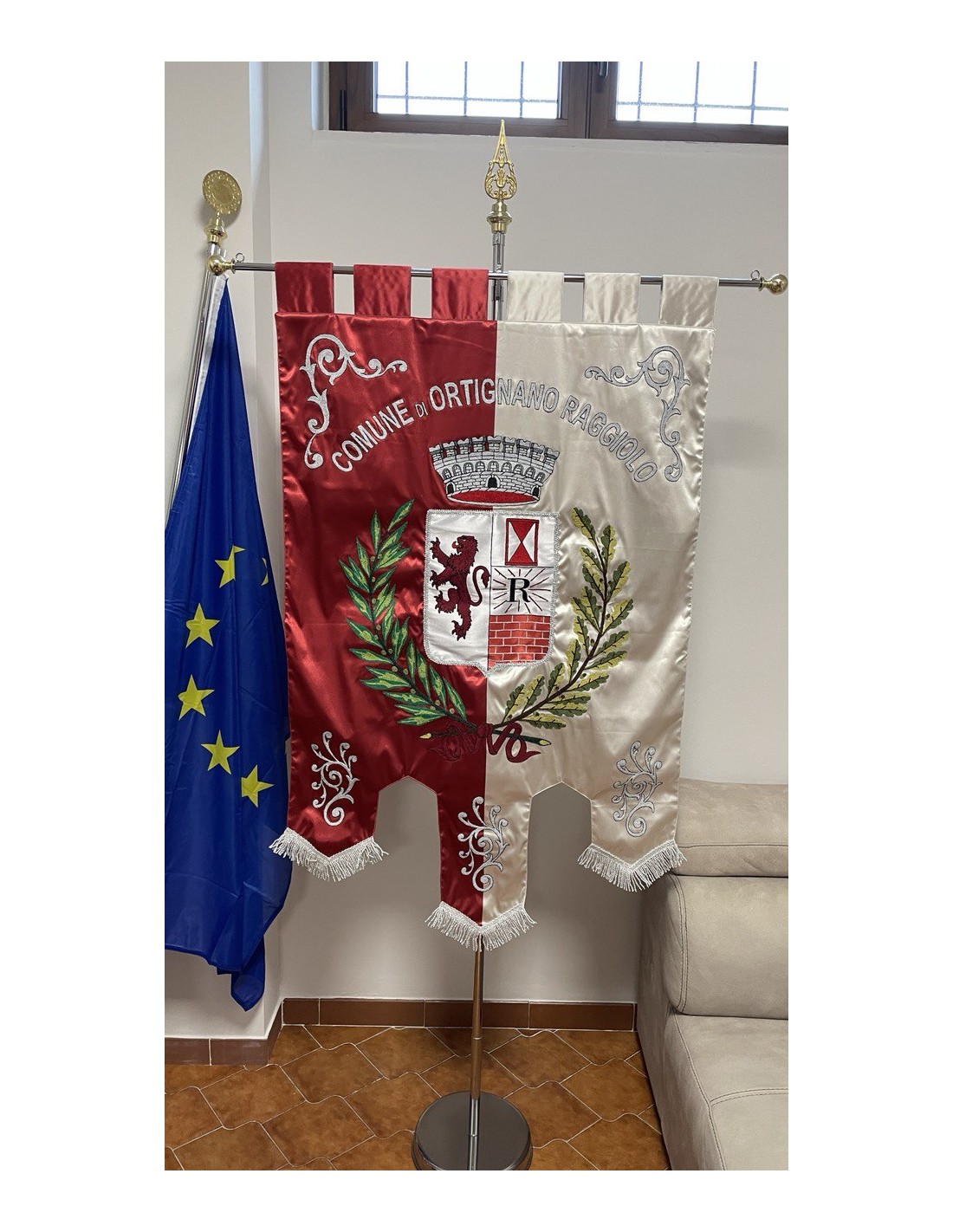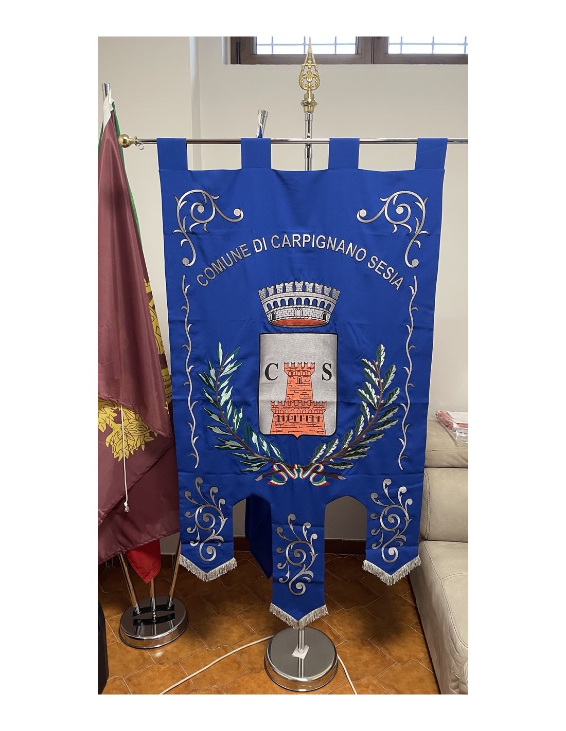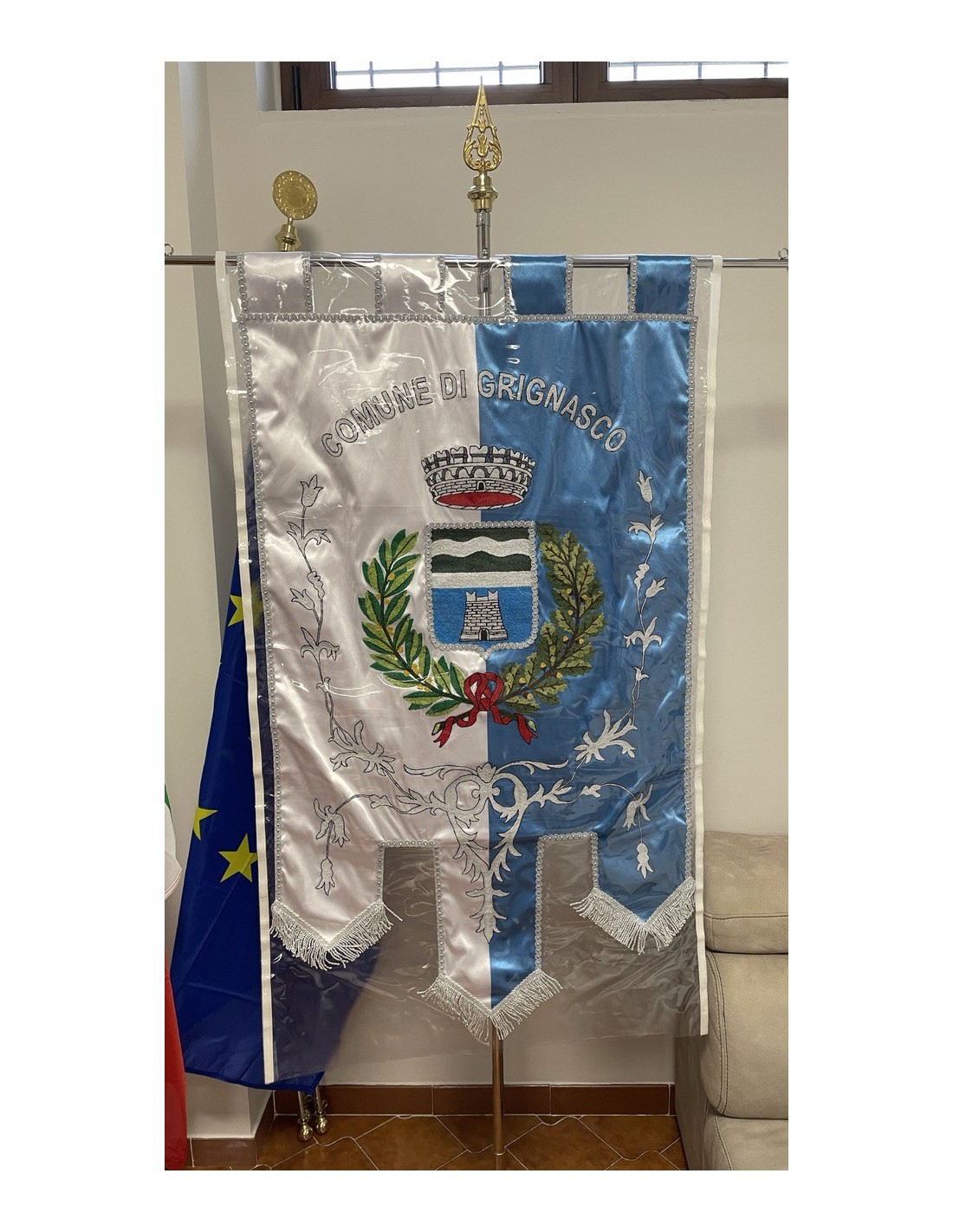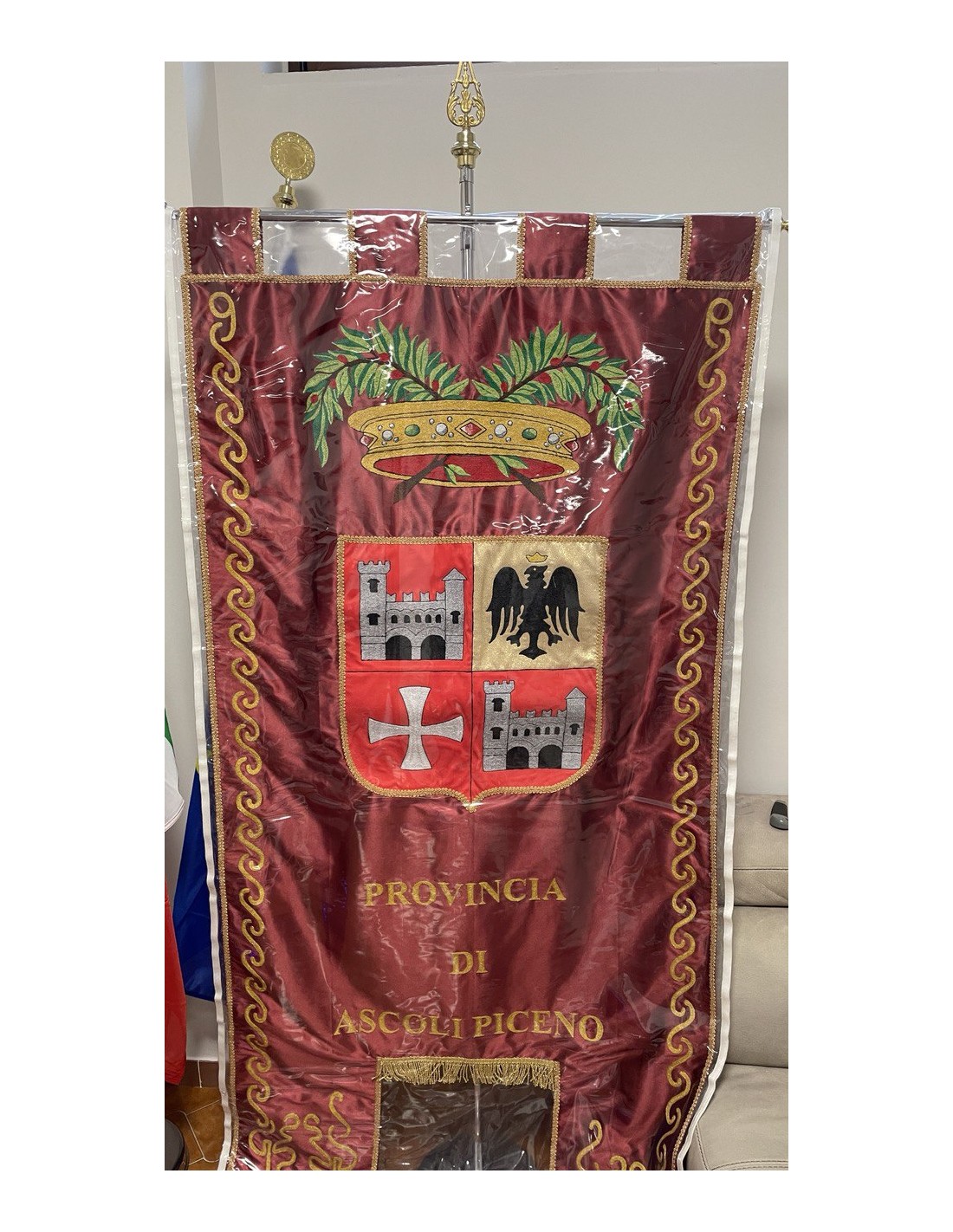 Gonfalone ricamato con code 100,00 iva esclusa di lavorazione aggiuntiva.