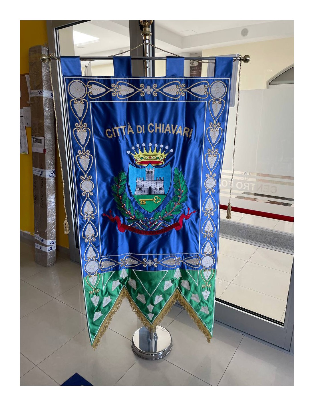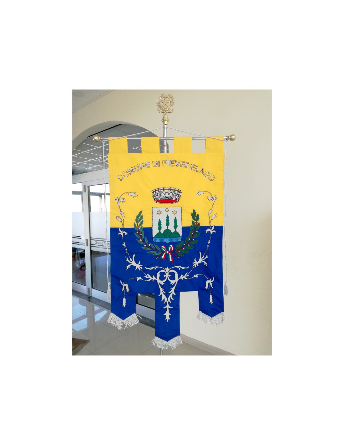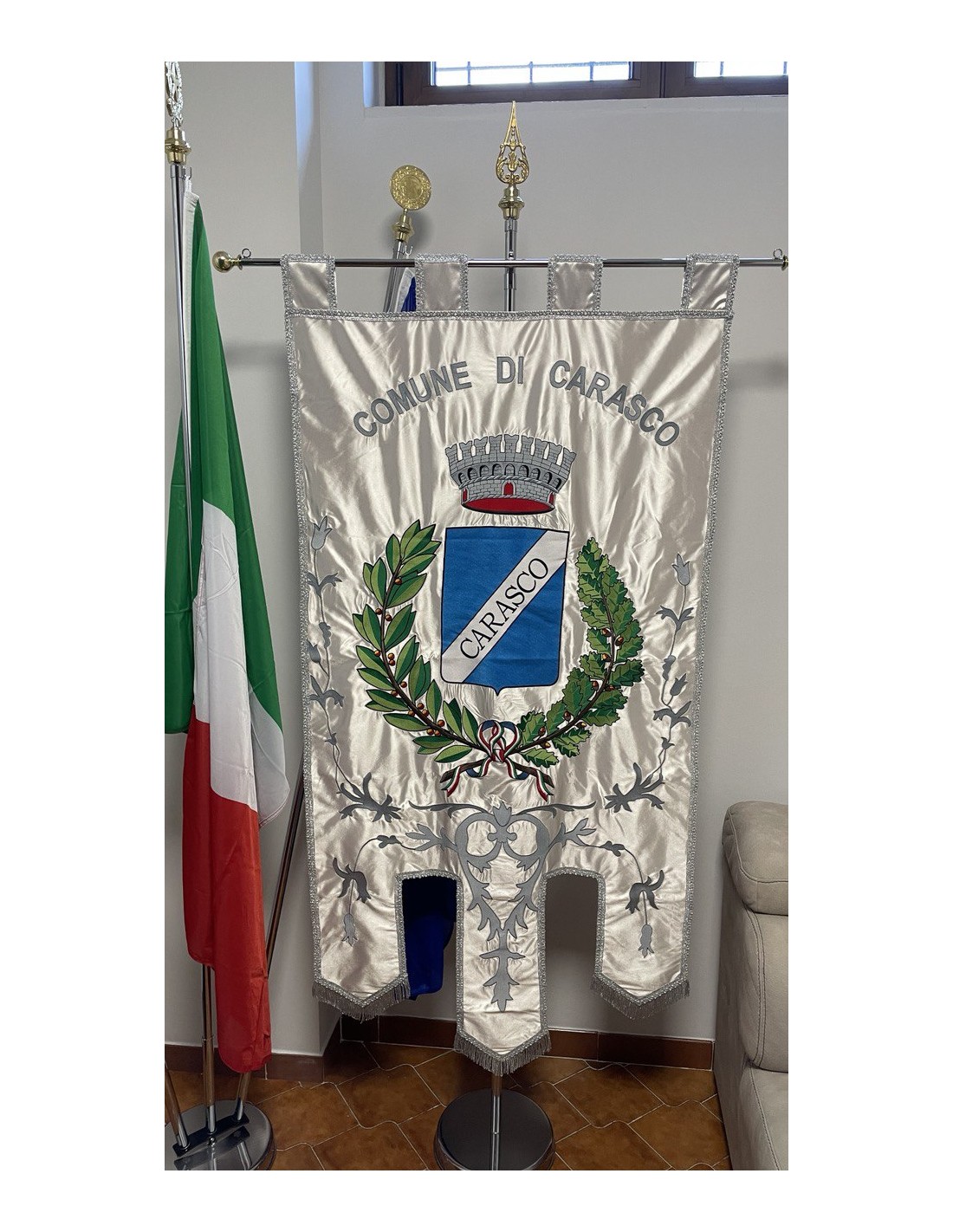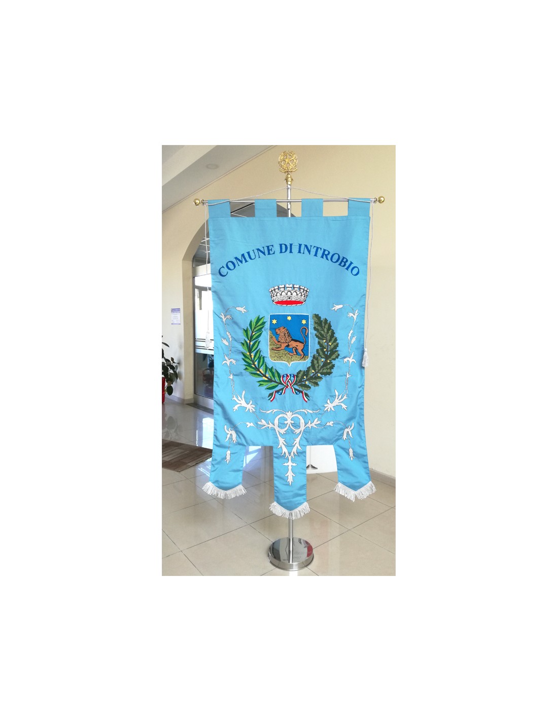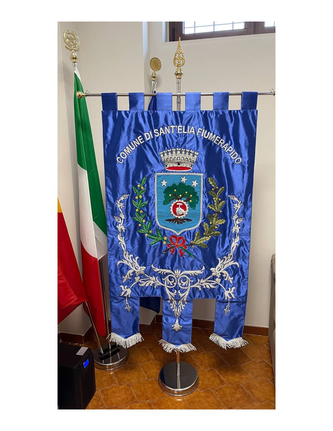 Gonfalone ricamato con code 100,00 iva esclusa di lavorazione aggiuntiva.