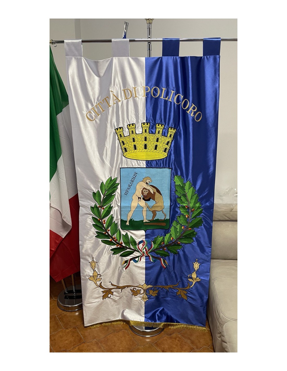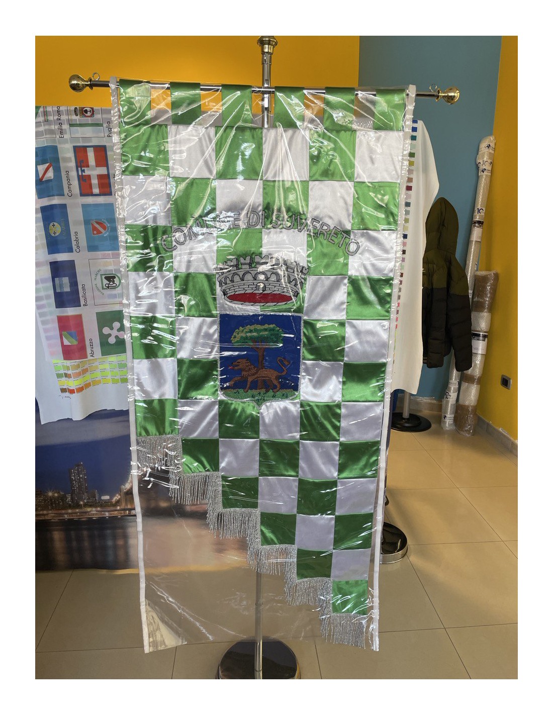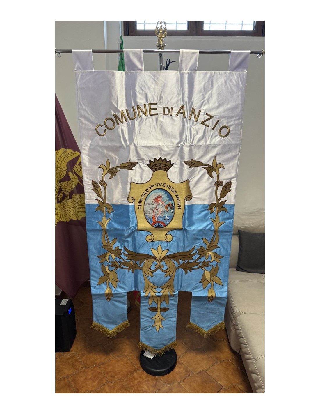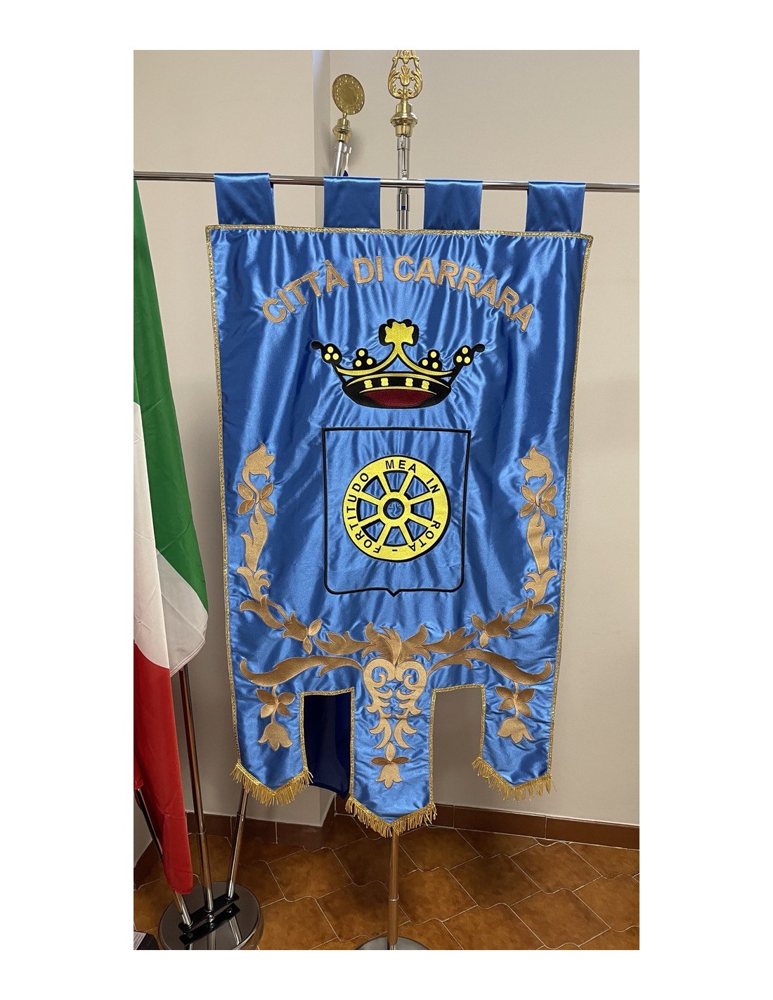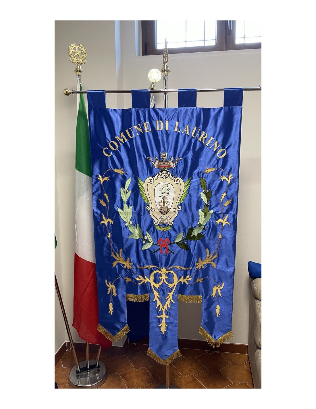 Gonfalone ricamato con code 100,00 iva esclusa di lavorazione aggiuntiva.